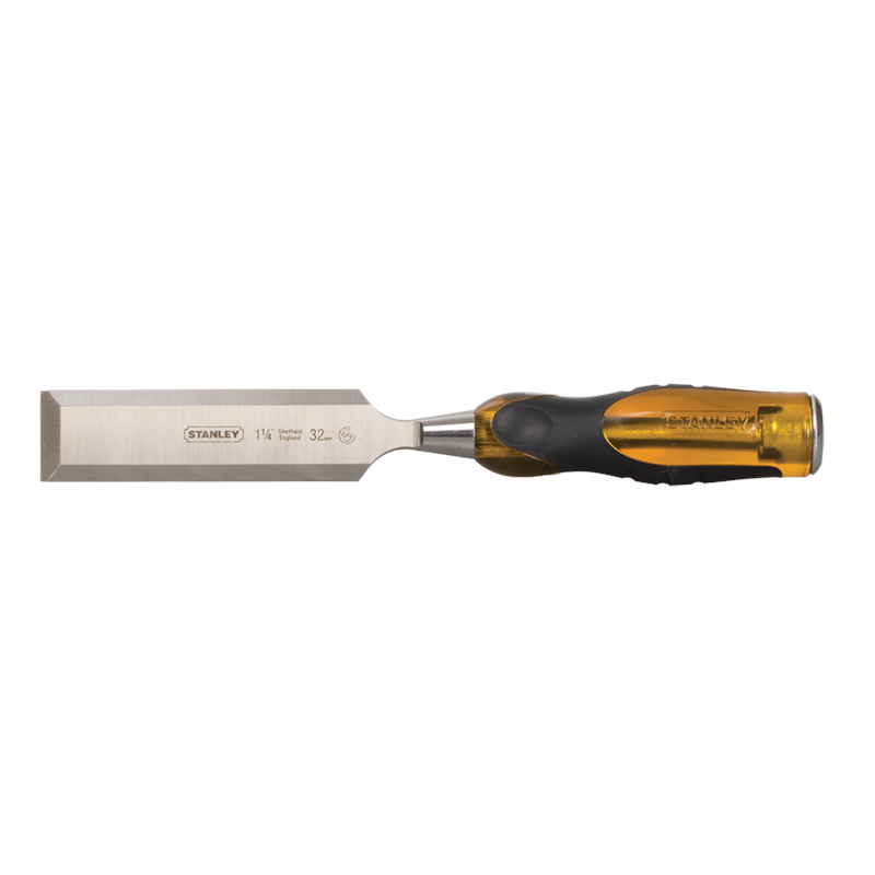 Full length bevel edged blades manufactured from chrome vanadium steel hardened; tempered and finely ground. Solid Impact-resistant soft grip handle allows Pound Thru striking end cap to be struck without causing damage.