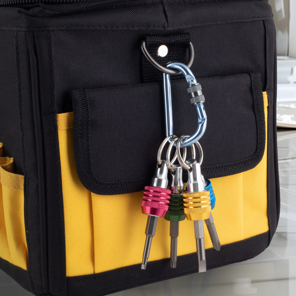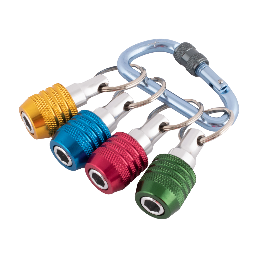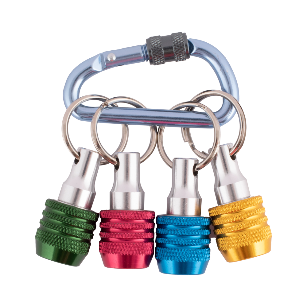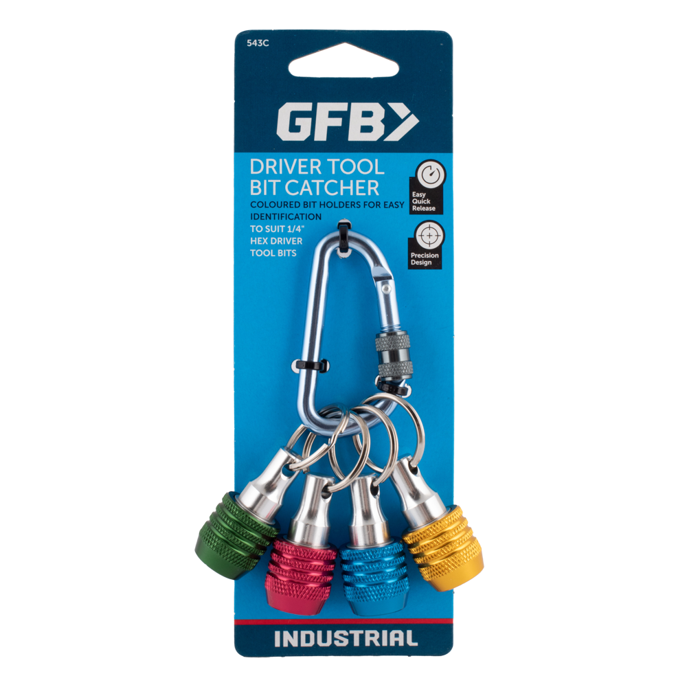 The GFB Driver Tool Bit Catcher 4pc Set is a game-changing accessory for anyone who uses 1/4” hex driver tool bits. This brilliantly designed bit holder comes in a range of vibrant colors, making it effortless to identify the right bit for the job at hand. Its precision engineering ensures a secure grip on your bits, preventing frustrating drops and time-wasting fumbles. The quick-release mechanism allows for swift bit changes, enhancing your efficiency. What’s more, its compact size lets you attach it to your key ring, ensuring you have this indispensable tool with you at all times. This set also features a carabiner to hold all 4 bit catchers and even more!