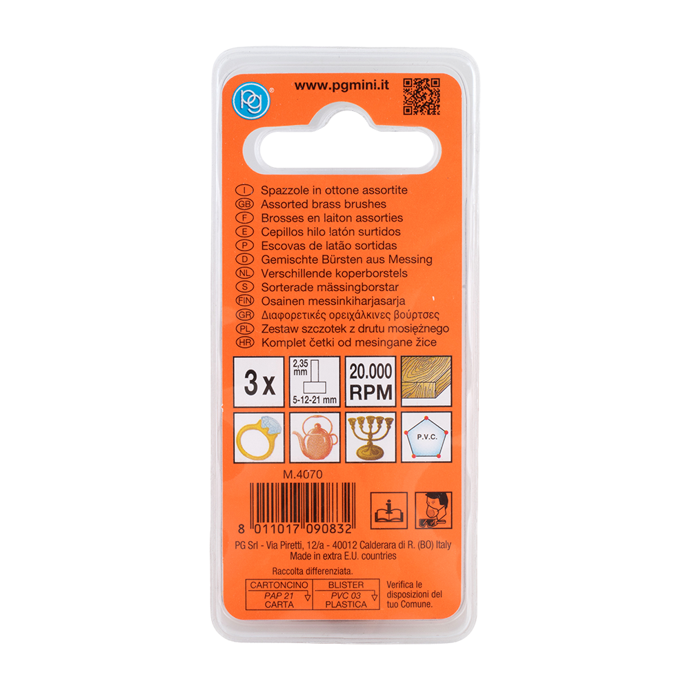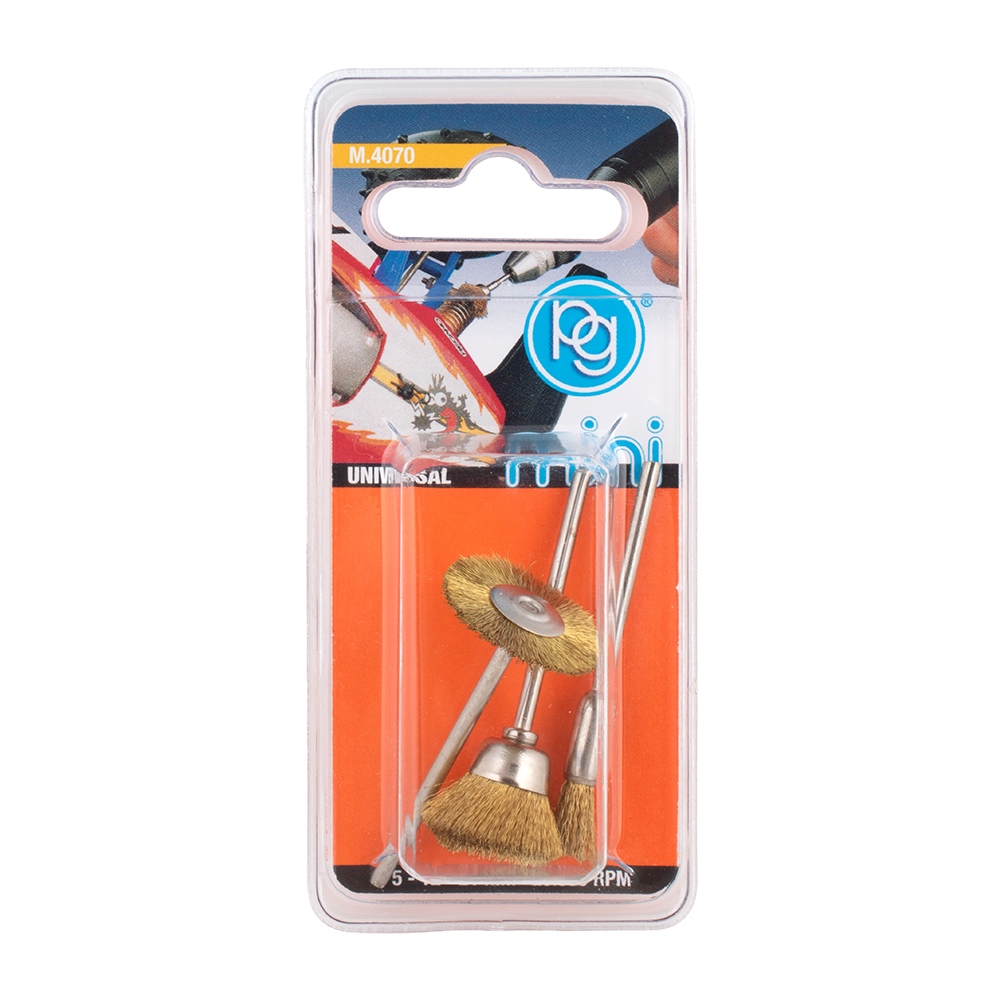 The PG Mini 3pc Brass Wire Brush Set is ideal for precision cleaning, deburring and light polishing tasks. Designed for use on wood and soft metals such as gold, copper and brass, these brushes provide effective cleaning without scratching delicate surfaces. They are also suitable for cleaning electrical components and small detailed areas. The set includes three assorted brass wire brushes: an end brush (Ø 5mm), wheel brush (Ø 21mm) and cup brush (Ø 12mm). Each brush features a 2.35mm round shank, making them compatible with most rotary tools for controlled, accurate work.