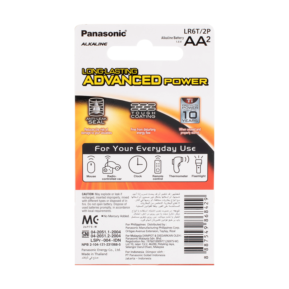 Trust Panasonic to power your day and get the most from every moment. Alkaline batteries deliver four benefits: better performance, long endurance, excellent value, and class-leading safety. With High Energy Formula optimizing the power reaction, Anti-Leak Seal protecting your devices, and Special Tough Coating enhancing reliability, Panasonic Alkaline provides effortless energy with greater peace of mind.