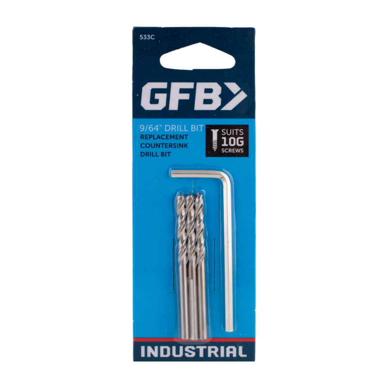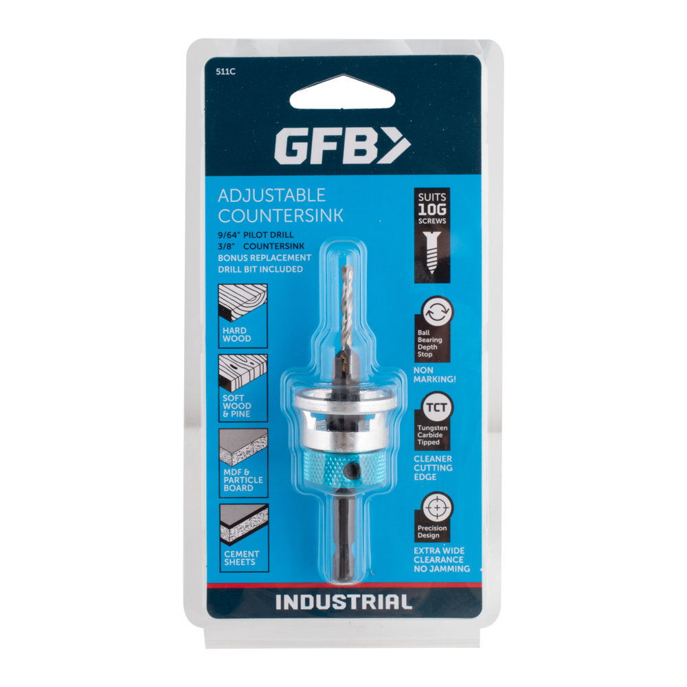 The GFB Adjustable Countersink with Depth Gauge is designed to deliver precision and efficiency, perfectly matching the depth of your job every time. Its ball bearing depth stop features a protective rubber rim to prevent marking, while the extra-wide clearance ensures no jamming. The tool includes a bonus pilot drill bit and an Allen Key for added convenience. With a quick-change 1/4" hex shank and a tungsten carbide cutting edge, it provides a cleaner cut. Ideal for use on hardwood, softwood, pine, MDF, particle board, and cement sheets, it drills screw pilot holes and countersinks in one action, perfect for both trade professionals and home handymen.