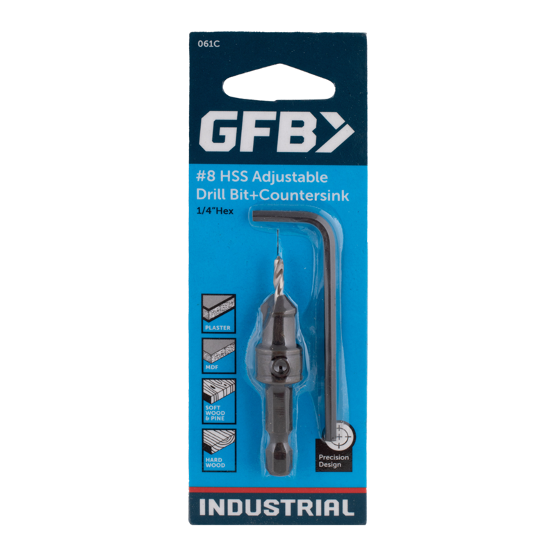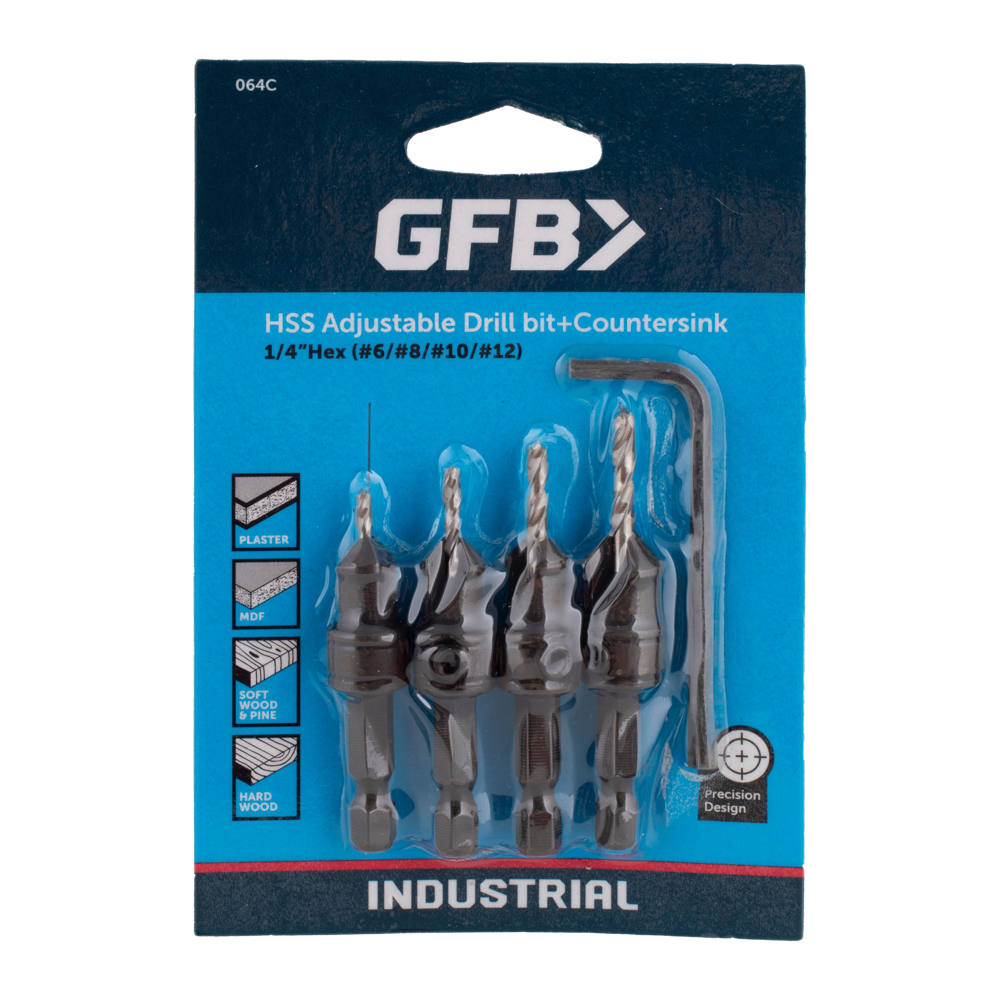 The GFB Adjustable Drill Bit & Countersink features a Quick Change 1/4" Hex Shank for seamless bit swaps. It includes an Allen Key for easy adjustment of the pilot drill. Equipped with a heavy-duty HSS screw bit, it's ideal for use on plasterboard, MDF, softwood, pine, and hardwood. This tool efficiently drills a screw pilot hole and countersinks in one action, making it perfect for both trade professionals and home handymen. This 4-piece set includes sizes to suit 6, 8, 10 & 12 gauge screws.