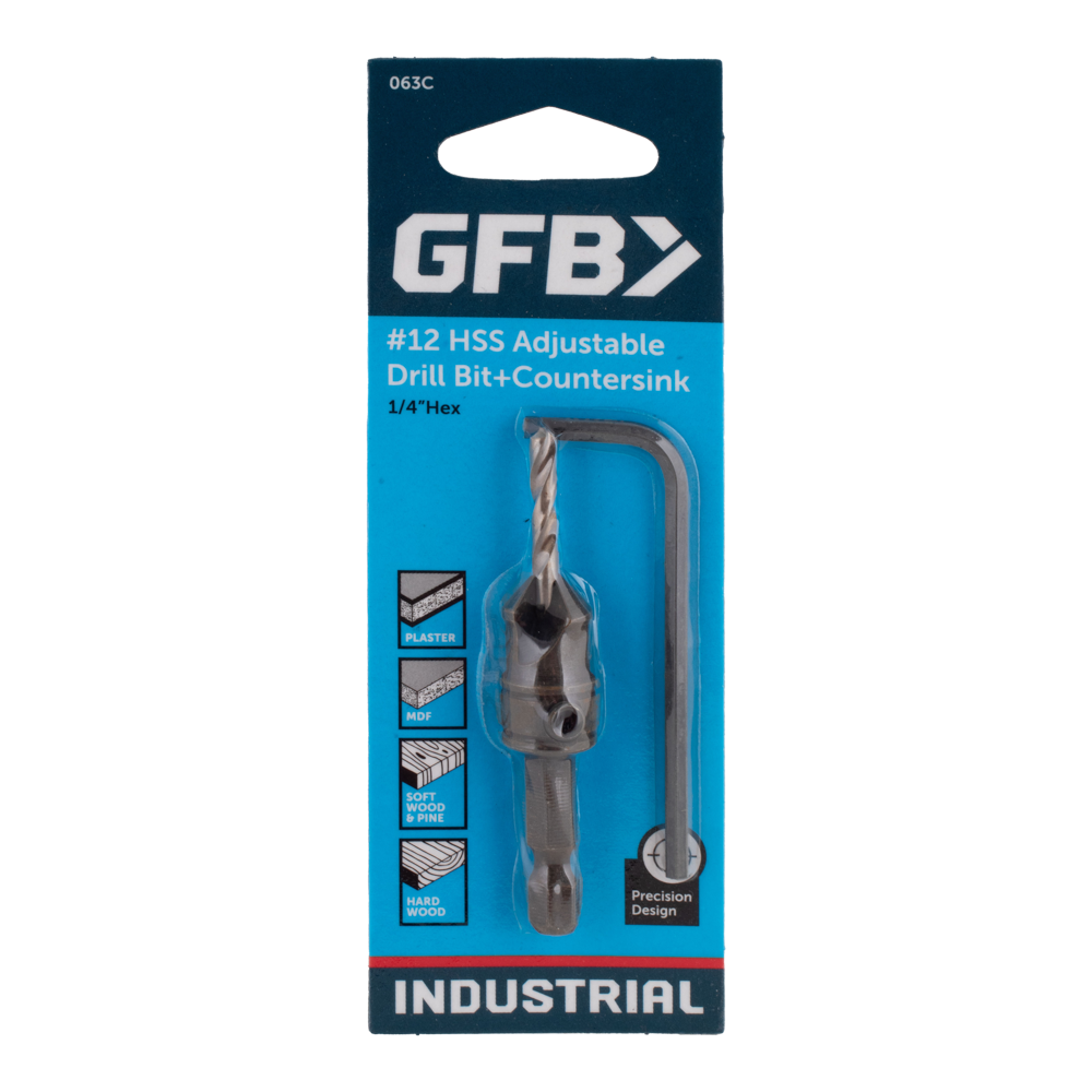 The GFB Adjustable Drill Bit & Countersink features a Quick Change 1/4" Hex Shank for seamless bit swaps. It includes an Allen Key for easy adjustment of the pilot drill. Equipped with a heavy-duty HSS screw bit, it's ideal for use on plasterboard, MDF, softwood, pine, and hardwood. This tool efficiently drills a screw pilot hole and countersinks in one action, making it perfect for both trade professionals and home handymen.