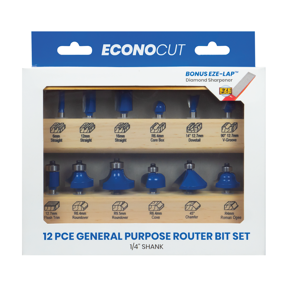 The Econocut 12pc General Purpose Router Bit Set is a must-have for any handyman or DIY enthusiast. This set includes the 12 most popular router bits, ensuring you have the right tool for various woodworking tasks. The bits are neatly organized in an attractive timber window box that offers excellent storage convenience. With a rotating bit holder, accessing the desired bit becomes a breeze. Featuring a 1/4" shank, which is highly favored among DIY users, all the bits provide a smoother cutting action with their two-flute design. As a bonus, this set includes the EZE-LAP™ Diamond Sharpener, with a fine 600-grit abrasive, perfect for all general sharpening needs with precision and ease.
