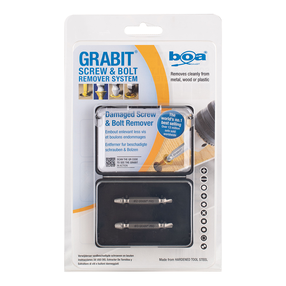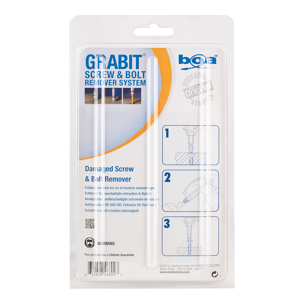 The BOA Grabit is an ingenious range of screw and bolt extractors. They will relieve you from the difficulties faced by rusted and damaged screws and bolts. They will remove broken, damaged, or embedded screws and bolts from metal, wood, ceramic, in fact, just about any type of material. Made of high-quality hardened steel, this Boa screw and bolt extractor 2-piece set fits all standard variable speed drills and will cleanly and effortlessly remove a variety of screws, bolts, and fasteners. This set of screw extractors includes sizes #2 and #3. One end of the bit is for drilling a pilot hole and the other end has a reverse thread for extracting the broken component. 13 million sets sold worldwide - The Boa Grabit is the world’s No 1 extractor product.