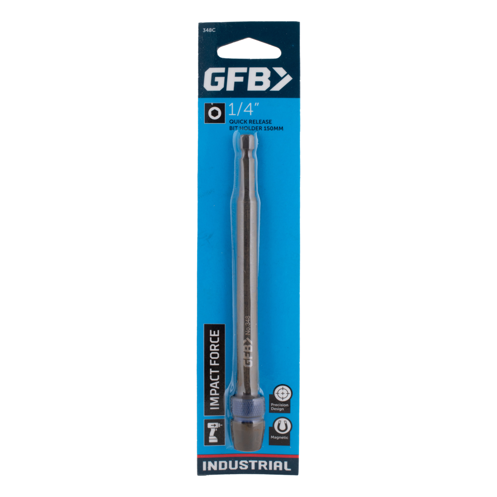 The GFB Quick Release Bit Holder is a premium tool engineered to the highest standards. It features a magnetic and smooth quick release anti-jamming mechanism, ensuring efficient bit changes and secure bit holding for 1/4" hex shank driver bits. This bit holder adds extra length, making it ideal for accessing tight spaces with ease. Specifically designed for use in impact drivers, it withstands heavy-duty applications, providing reliable performance and durability. GFB Quick Release Bit Holders are industrial tough and perfect for top-line industries.