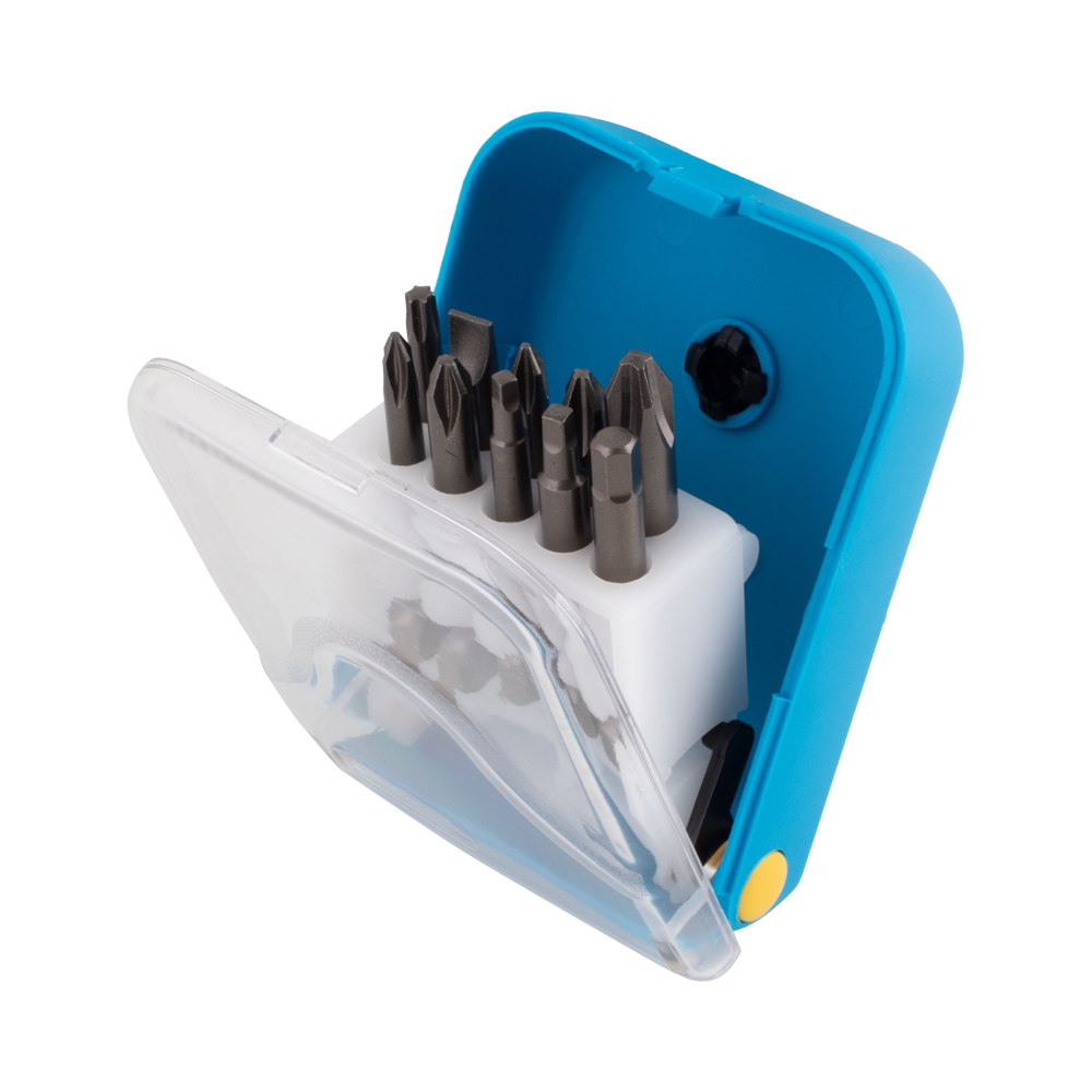 The GFB 10pc Assorted Screwdriver Bit Set is meticulously crafted for tradesmen and professionals, ensuring precision and durability. Manufactured from high-quality steel and tempered twice under intense heat, these Industrial Tough bits are exceptionally strong and long-lasting. Their magnetic feature enhances ease of use, securely gripping screws during intricate tasks. With a 1/4” Hex shank for quick changes, they come neatly organized in a pocket-sized plastic storage case. The case also includes a belt clip for added convenience. The set includes a mix of Phillips, Square, Hex, Torx, Slotted, and PoziDriv bits.
