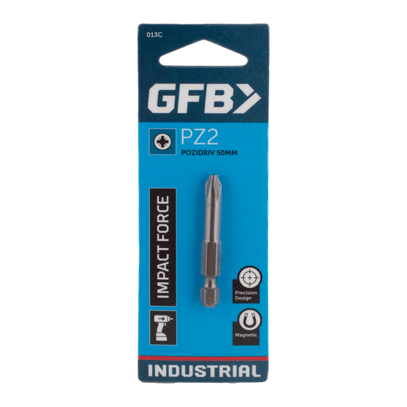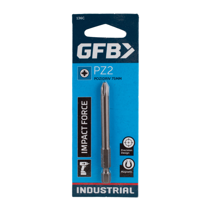The GFB Pozidriv Screwdriver Bits are meticulously crafted for tradesmen and professionals, ensuring precision and durability. Manufactured from high-quality steel and tempered twice under intense heat, these Industrial Tough bits are exceptionally strong and long-lasting. Their magnetic feature enhances ease of use, securely gripping screws during intricate tasks. The Pozidriv design minimizes cam-out and maximizes torque transfer, ensuring secure and reliable fastening of screws.