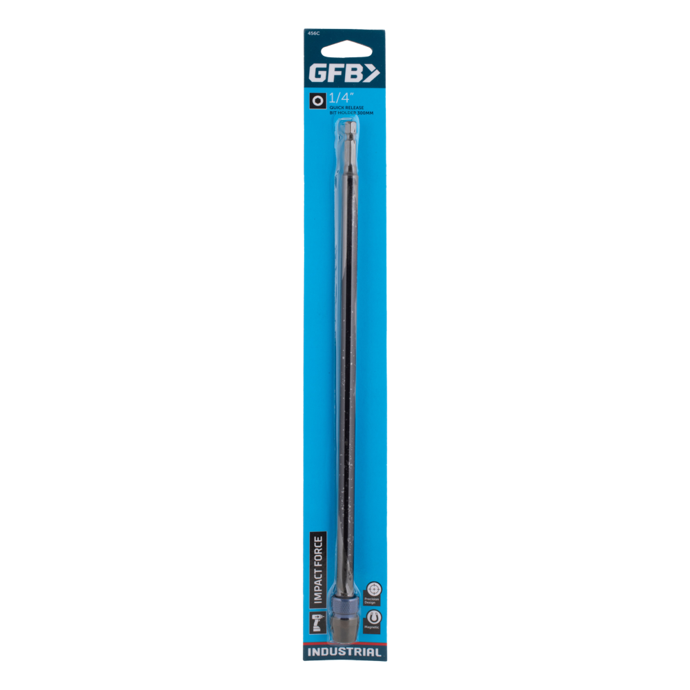 The GFB Quick Release Bit Holder is a premium tool engineered to the highest standards. It features a magnetic and smooth quick release anti-jamming mechanism, ensuring efficient bit changes and secure bit holding for 1/4" hex shank driver bits. This bit holder adds extra length, making it ideal for accessing tight spaces with ease. Specifically designed for use in impact drivers, it withstands heavy-duty applications, providing reliable performance and durability. GFB Quick Release Bit Holders are industrial tough and perfect for top-line industries.
