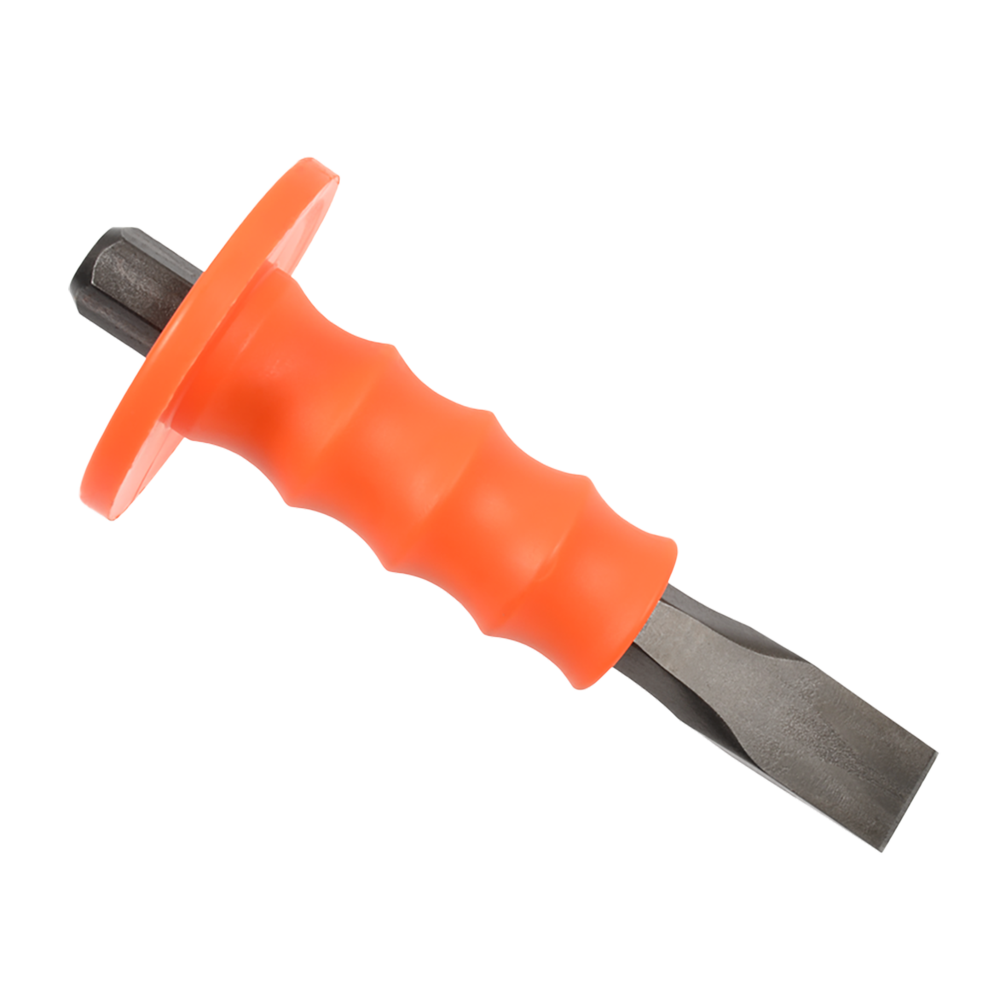 Hand guarded cold chisels act to shape and cut cold metal only. A hard plastic, ergonomic handle allows the user to firmly grip the tool for precision, comfort and shock absorbance. These chisels are specially angled for strength and available in a shot- blasted finish to increase durability. Many lengths and sizes are offered to fit any application. Made in the USA.