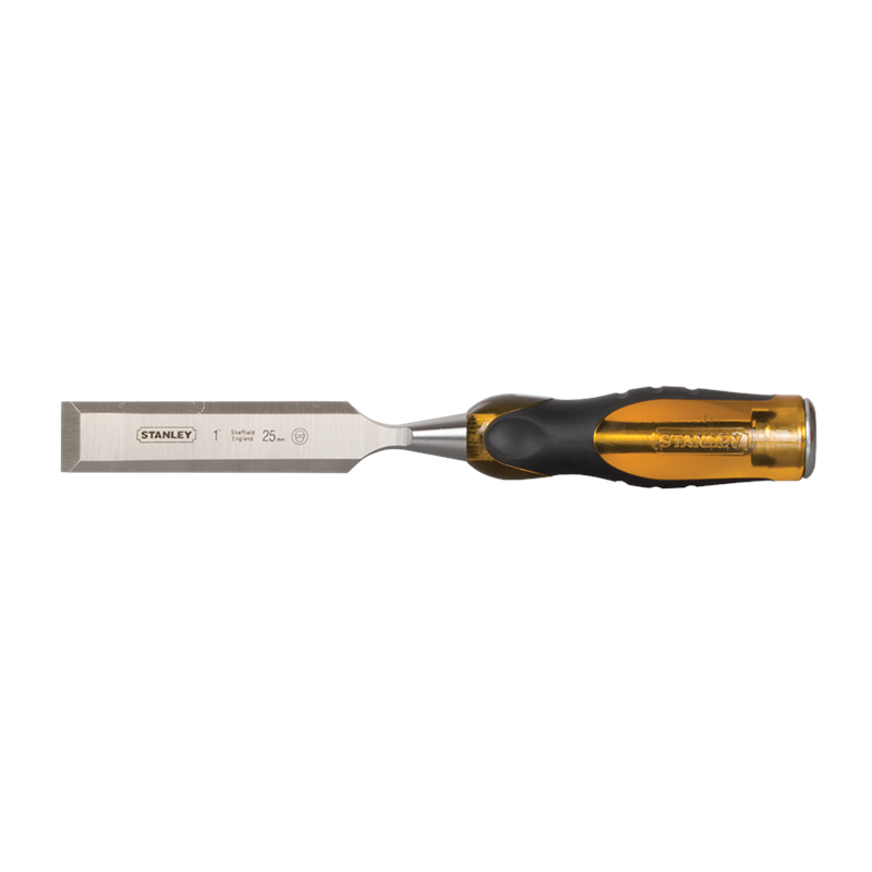 Full length bevel edged blades manufactured from chrome vanadium steel hardened; tempered and finely ground. Solid Impact-resistant soft grip handle allows Pound Thru striking end cap to be struck without causing damage.