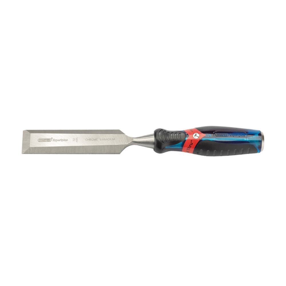 Full length bevel edged blades manufactured from chrome vanadium steel hardened; tempered and finely ground. Solid Impact-resistant soft grip handle allows Pound Thru striking end cap to be struck without causing damage.