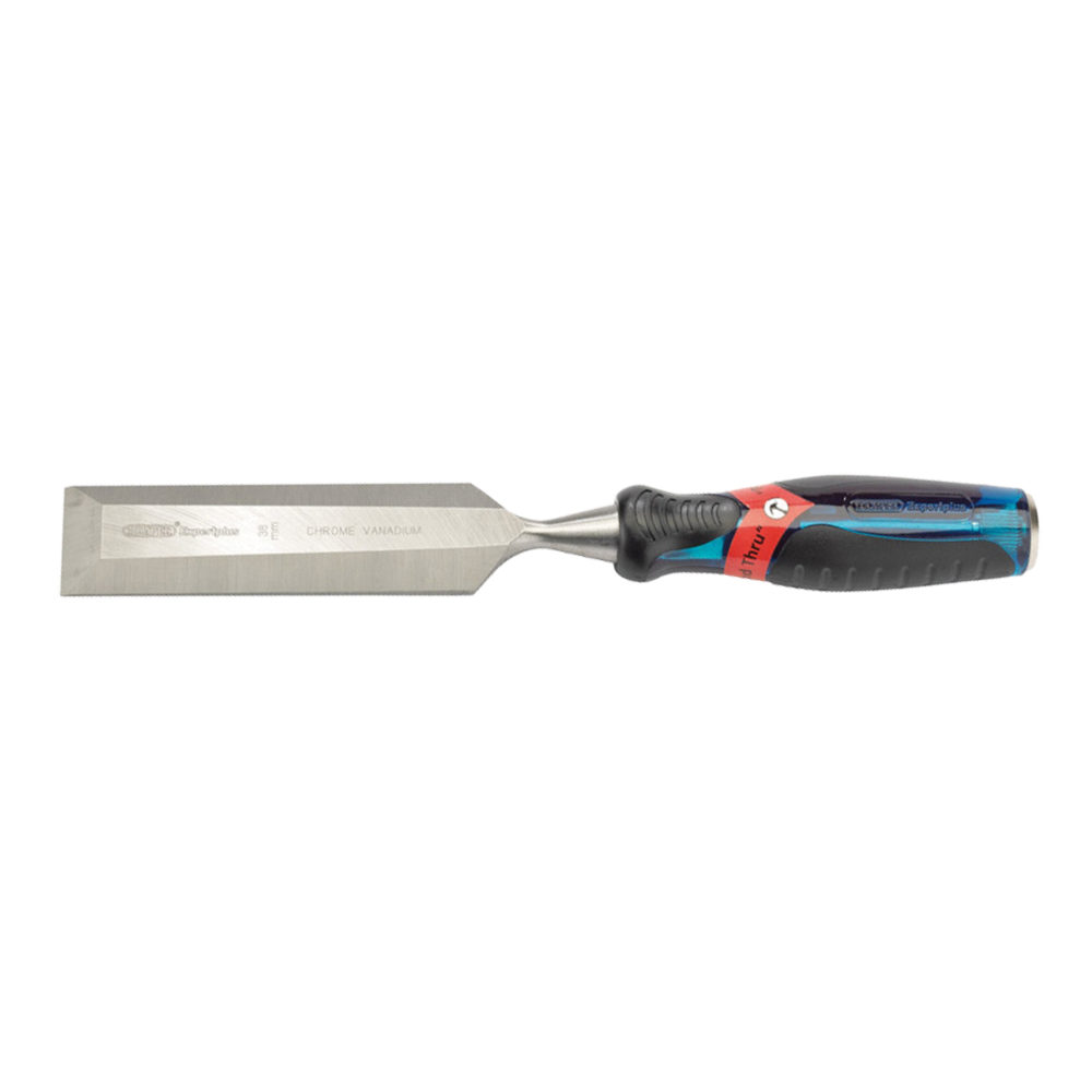Full length bevel edged blades manufactured from chrome vanadium steel hardened; tempered and finely ground. Solid Impact-resistant soft grip handle allows Pound Thru striking end cap to be struck without causing damage.