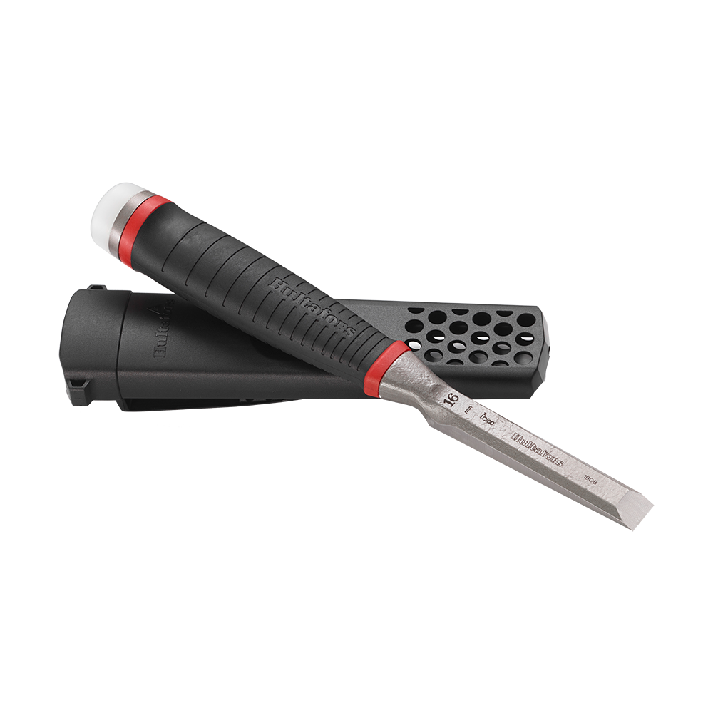 Chisels for tasks that require strength and precision. Forged in one piece with continuous robust I-profile for extreme breaking strength and to maximize the power transmission down into the workpiece. Impact resistant nylon striker that can be replaced when worn down. 25° cutting edge for an optimal ratio between sharpness and durability. The entire blade, including the handle, can be placed flat against the surface which allows you to cut parallel to a flat surface.