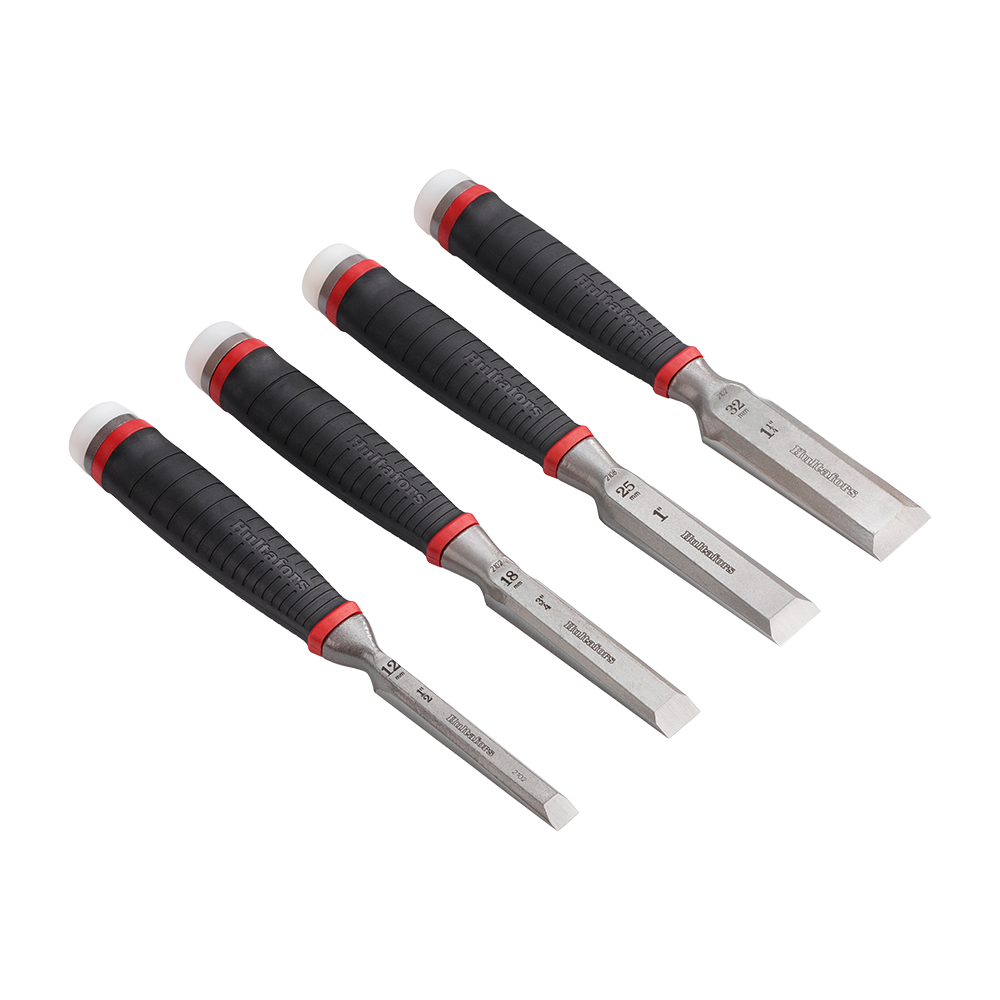 Set with 4 chisels and holsters for any type of work, whether it requires strength or precision. They are forged in one piece with two hardening zones and a robust I-profile that goes through the entire handle. This makes them extremely tough and maximizes the power transmission into the workpiece. A 25° grind gives the edge an optimal ratio between sharpness and durability. They can be resharpened down almost the entire blade length giving them a very long lifespan. The entire chisel, including the handle, can be placed completely flat against a surface allowing you to make a perfect parallel cut. The nylon end cap can be replaced if it gets worn out.