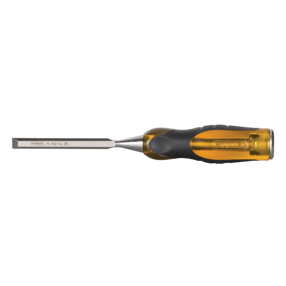 10mm blade width chisel with a shatterproof polymer handle incorporating a steel striking cap; and is resistant to most solvents. The bevel edged blade is manufactured from high quality EN31 grade steel.