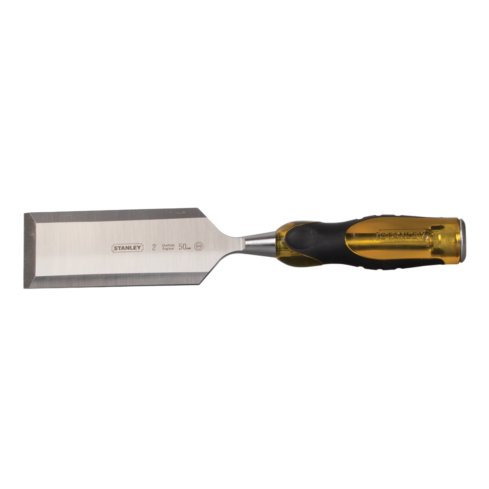 50mm blade width chisel with a shatterproof polymer handle incorporating a steel striking cap; and is resistant to most solvents. The bevel edged blade is manufactured from high quality EN31 grade steel.