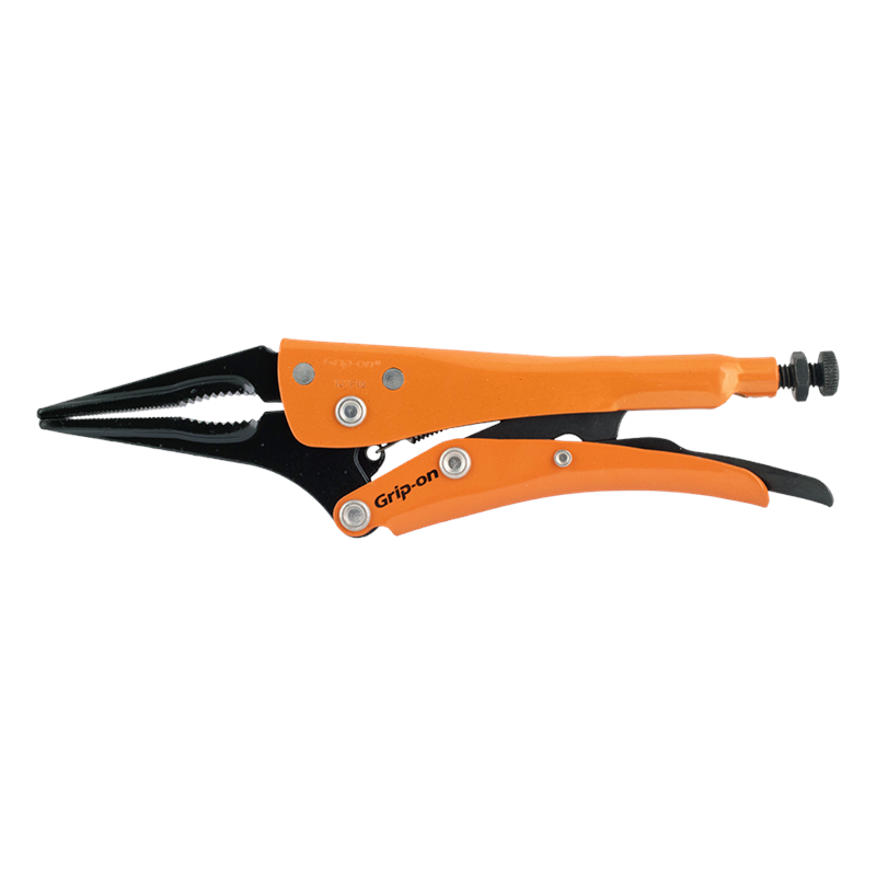 The Grip-On Series 127 Long Nose Locking Plier is an essential tool that provides great assistance when holding, placing or extracting pieces in awkward areas such as engines. Its long slim jaw design enables the pliers to reach deep into recessed areas while the curved section allows it to hold rounded objects. The adjustable jaw opening makes it suitable for various tasks. Its ergonomic design offers comfortable handling, and the no pinch easy release feature ensures safety. The concave profile of the pliers provides better push-pull action, making it an ideal tool for a wide range of tasks. The superior quality of the forged steel jaws ensures durability, and the epoxy paint coating on the handle is 20x more corrosion-resistant than nickel.
