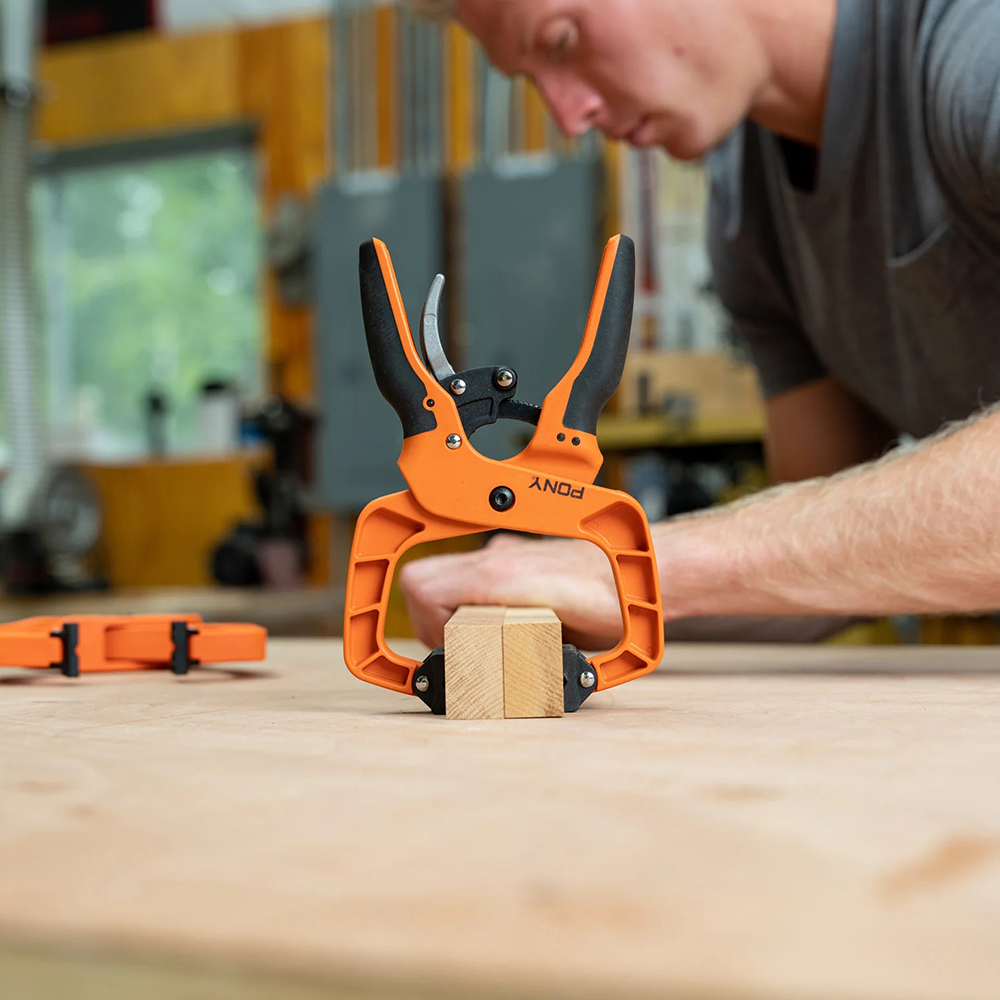 Pony hand clamps feature an innovative box?joint design that prevents twisting and keeps the jaws square and straight. Our patented adjustment mechanism allows you to adjust clamping pressure to your desired needs without any additional tools. The soft, pivoting jaw pads are ideal for holding delicate work and are riveted to the jaws to ensure they never come off. Soft handles are ergonomically designed for comfortable use.