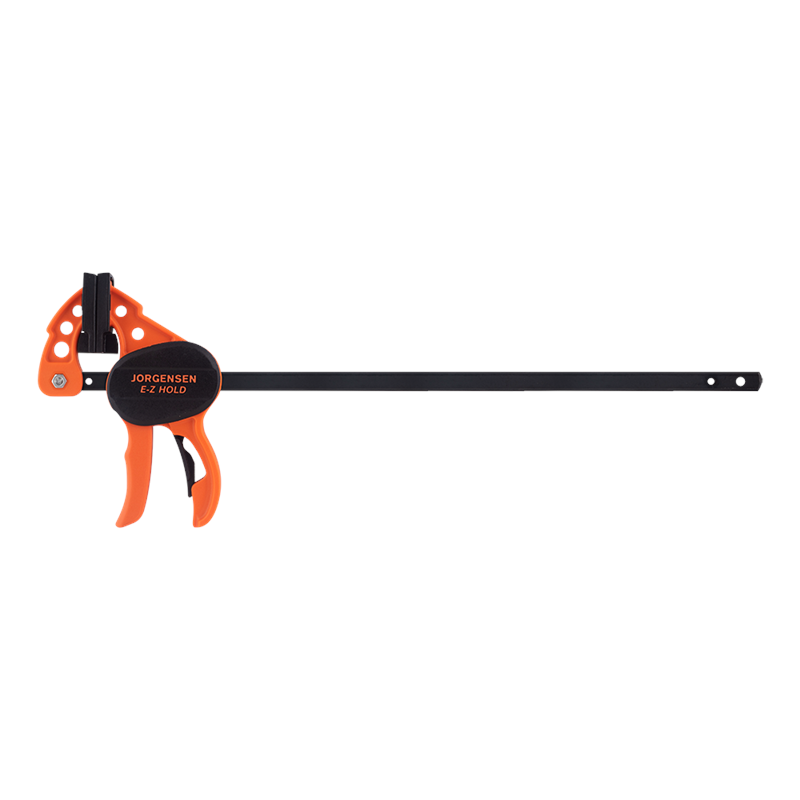 Introducing the Jorgensen E-Z HOLD Light-duty bar clamps, a groundbreaking innovation that enables effortless one-handed clamping. These versatile clamps go beyond traditional functionality by easily transforming into convenient spreader clamps. Featuring a contoured comfort grip and a quick-release lever, achieving a secure hold is incredibly easy. What sets these clamps apart is their exclusive patented feature, allowing you to connect two clamps together and double the opening capacity. With deep-reach pads ensuring optimal workpiece protection, these clamps are indispensable for any project. Moreover, their compact, hand-sized design makes them highly portable for convenient transportation. Experience the convenience and efficiency of Jorgensen E-Z HOLD Light-duty bar clamps today!