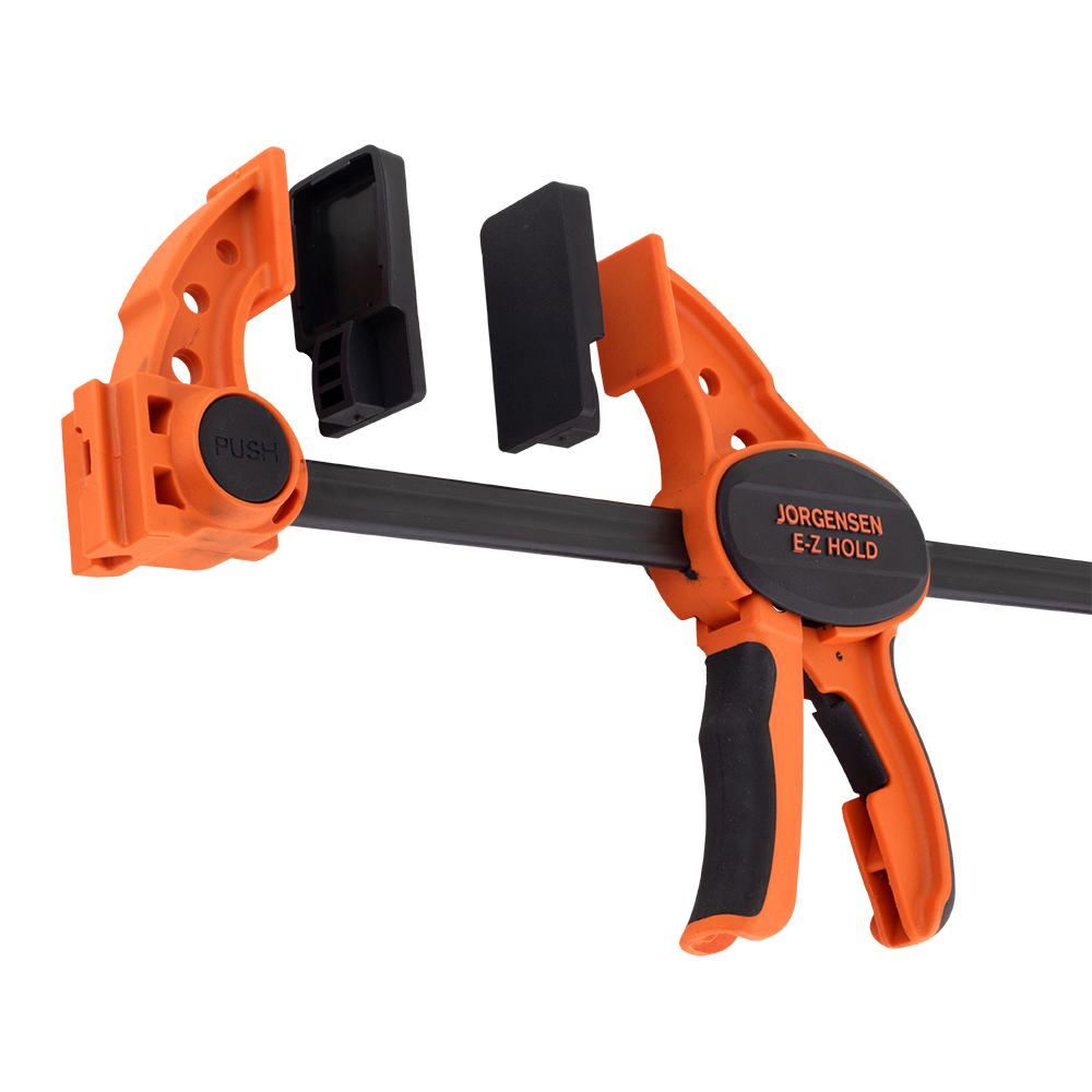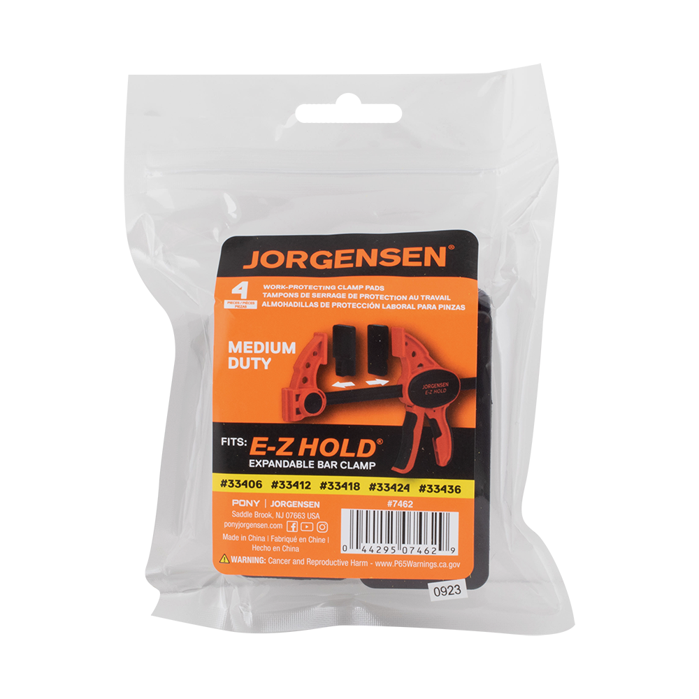 The Clamping Pads Set is designed as replacements for the Jorgensen 334 Series Medium-Duty E-Z HOLD Expandable Bar Clamps. These soft, durable plastic pads eliminate the need for traditional wood blocks, offering a resilient, nonstick, nonslip cushion. Ideal for clamping wood, metal, and plastic surfaces, each set includes 4 pads, enough to replace pads on 2 clamps. They provide a protective barrier that securely grips surfaces during clamping, ensuring a firm hold without damaging materials, making them essential accessories for woodworking and metalworking projects alike.