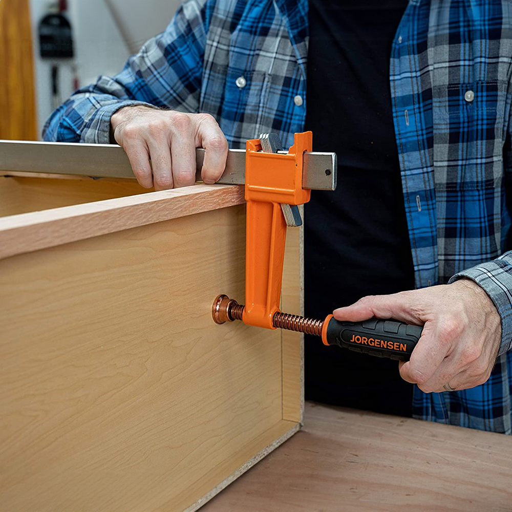 When your project calls for a deeper hold, reach for Jorgensen deep throat steel bar F-clamps. They contain all the same high quality materials as our traditional steel bar clamps but with five?inch reach. Cast iron stationary and sliding heads with an orange, powder coated finish are merged with a high carbon, rust resistant steel bar that packs a whopping 80,000 pounds per square inch of tensile strength. Welders take note: the copper plated screws, handles, and swivels help protect against weld spatter in welding jobs. The clamps are equipped with a soft grip handle for added comfort. Furthermore, our innovative multiple-disc-clutch design enables the sliding head to securely hold at any desired position along the bar.