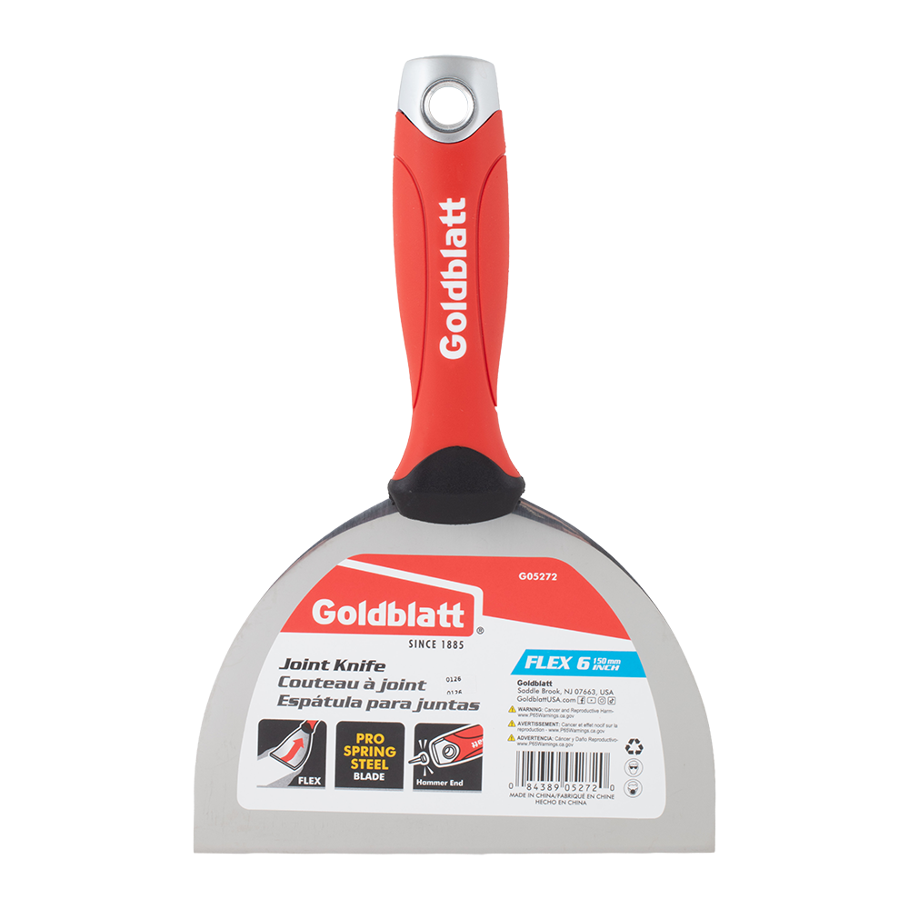 Goldblatt Putty & Joint Knives feature premium hollow-ground spring steel blades for proper flexibility and feel. Perfect for feathering, smoothing, and finishing of drywall seams. The high-quality spring steel blade offers better rust resistance and out-performs than competitors regular carbon steel. Designed for comfort and control, the extra-large over-mould soft-grip handle reduces fatigue and provides improved leverage, with a convenient hanging hole for easy storage. A durable metal hammer end allows for setting popped nails and screws, making these knives ideal for professional and DIY drywall work.