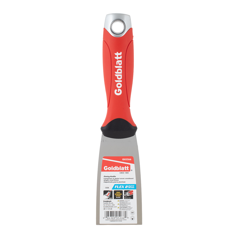 Goldblatt Putty & Joint Knives feature premium hollow-ground spring steel blades for proper flexibility and feel. Perfect for feathering, smoothing, and finishing of drywall seams. The high-quality spring steel blade offers better rust resistance and out-performs than competitors regular carbon steel. Designed for comfort and control, the extra-large over-mould soft-grip handle reduces fatigue and provides improved leverage, with a convenient hanging hole for easy storage. A durable metal hammer end allows for setting popped nails and screws, making these knives ideal for professional and DIY drywall work.