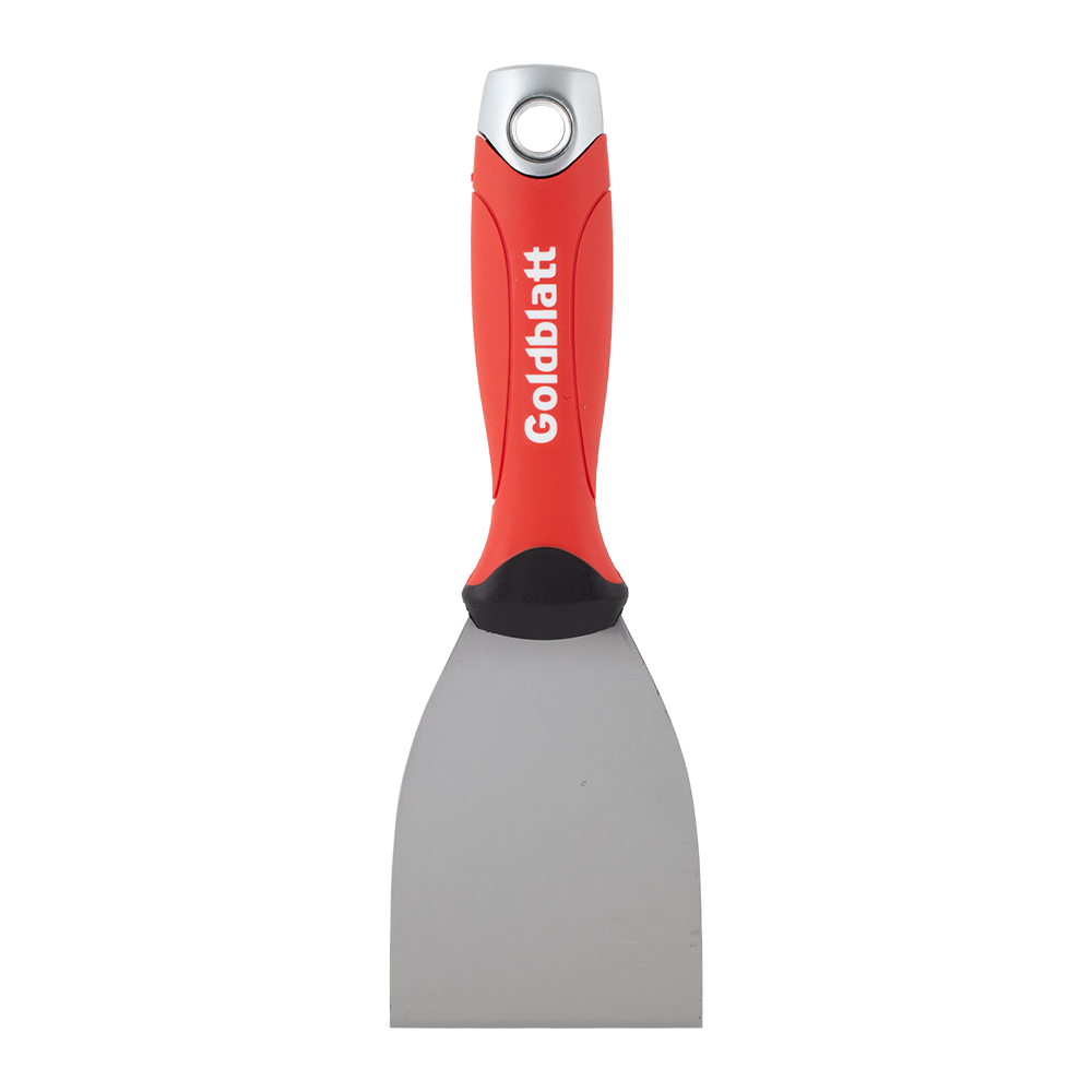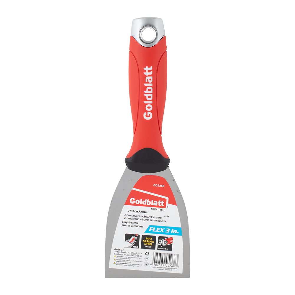 Goldblatt Putty & Joint Knives feature premium hollow-ground spring steel blades for proper flexibility and feel. Perfect for feathering, smoothing, and finishing of drywall seams. The high-quality spring steel blade offers better rust resistance and out-performs than competitors regular carbon steel. Designed for comfort and control, the extra-large over-mould soft-grip handle reduces fatigue and provides improved leverage, with a convenient hanging hole for easy storage. A durable metal hammer end allows for setting popped nails and screws, making these knives ideal for professional and DIY drywall work.