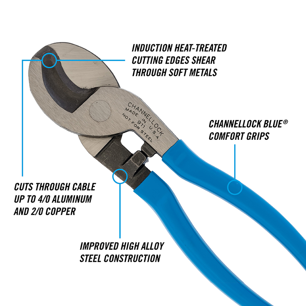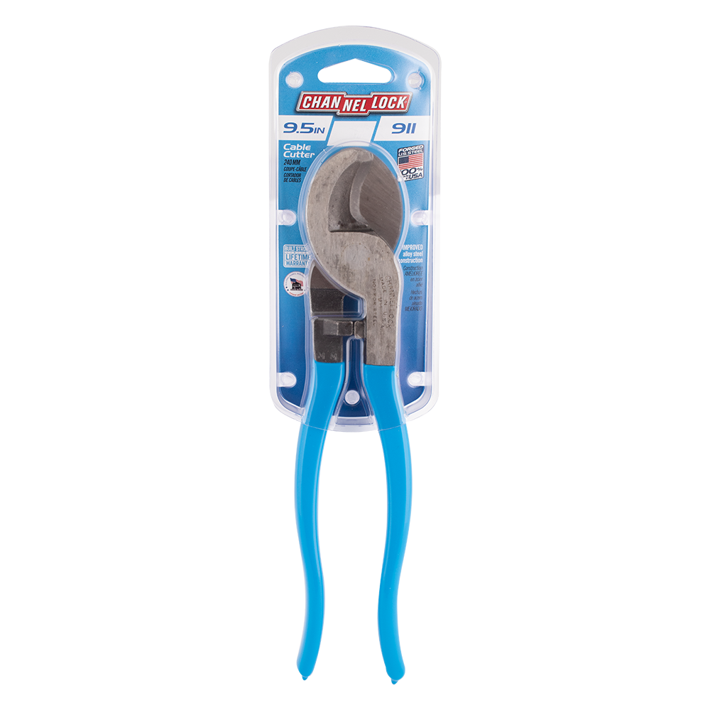 Channellock 911 9.5” Cable Cutting Pliers feature an improved high alloy steel for strength and durability. Easily cut through battery cables and other soft metals and cable up to 4/0 aluminum and 2/0 copper. These pliers are not intended for cutting steel or ACSR. The Channellock model 911 is made in USA and forged from high alloy steel that is specially coated for ultimate rust prevention.