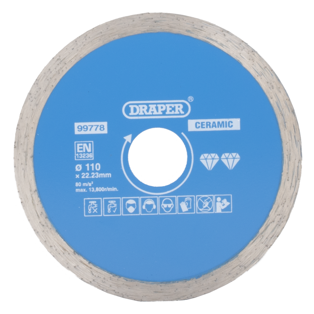 Hardened and tempered diamond blade with continuous rim to provide a smooth cutting finish. Designed for use on ceramic and natural stone tiles. Suitable for dry and wet cutting, with optimum results when used wet. Compatible with most angle grinders and tile cutting machines with a 22.23mm bore.