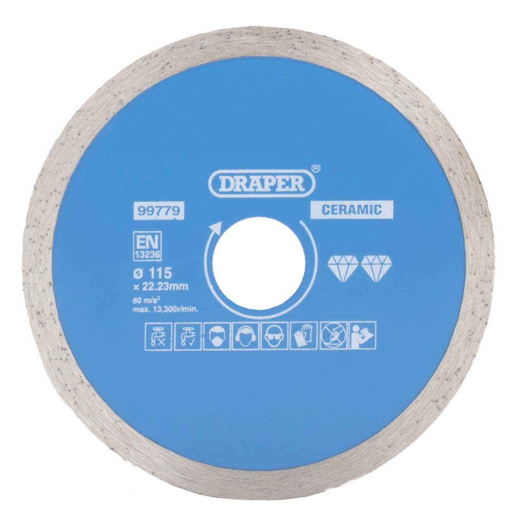 Hardened and tempered diamond blade with continuous rim to provide a smooth cutting finish. Designed for use on ceramic and natural stone tiles. Suitable for dry and wet cutting, with optimum results when used wet. Compatible with most angle grinders and tile cutting machines with a 22.23mm bore.