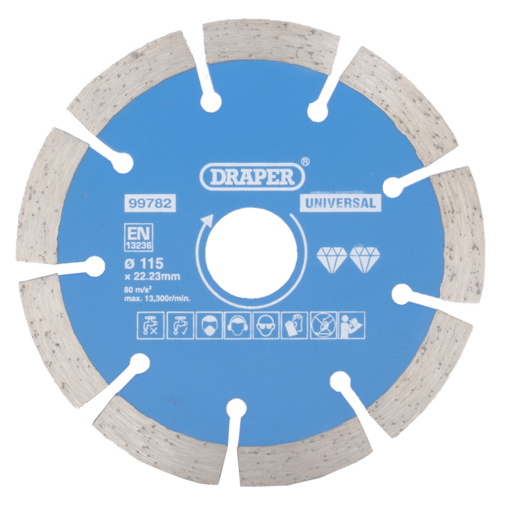 Hardened and tempered diamond blade with segmented rim for a faster cut. General purpose blade for use on concrete, bricks, stone, granite and marble. Suitable for dry and wet cutting, with optimum results when used wet. Compatible with most angle grinders with a 22.23mm bore.