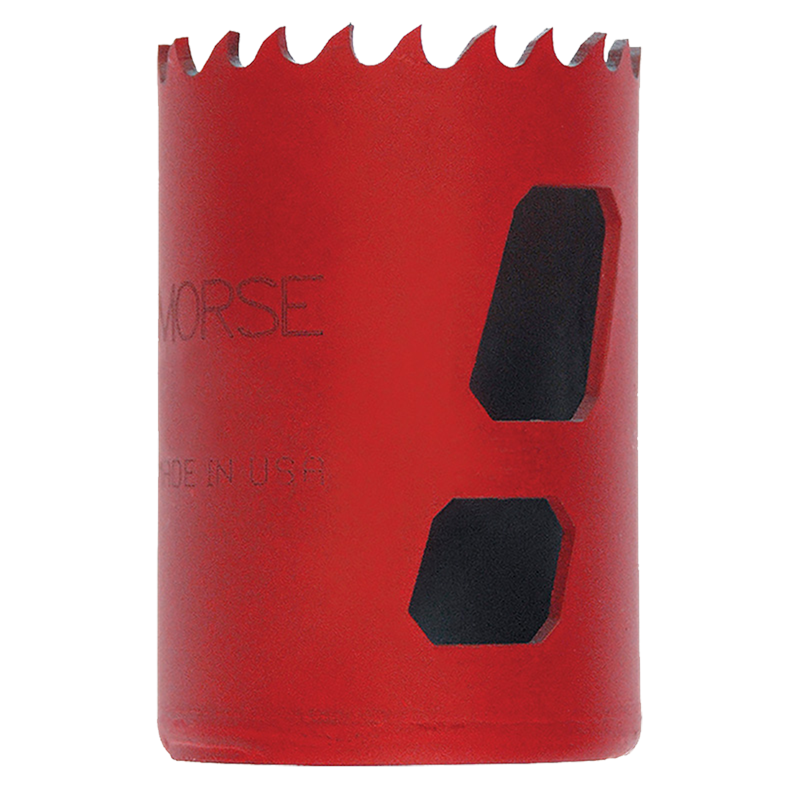 Hardened heat resistant positive rake HSS teeth with alloy backing. Strong and shatter resistant. Economically cuts wood metal and steel. For hand held or fixed drills. 2" cutting depth.