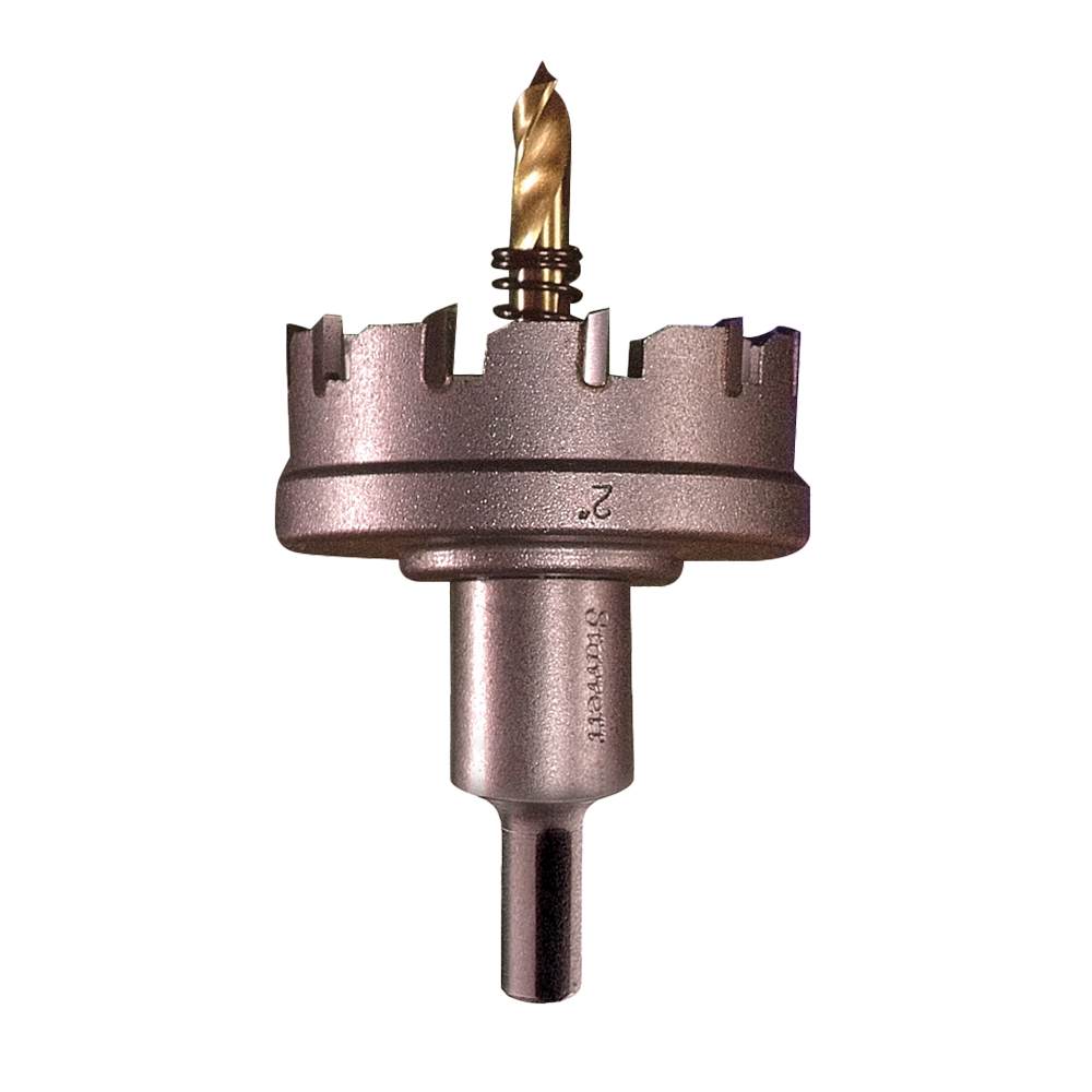 Tungsten carbide tipped with positive rake teeth for high alloy and stainless steels, nonferrous metals and reinforced fabrics. Complete assembly with arbor and pilot drills.