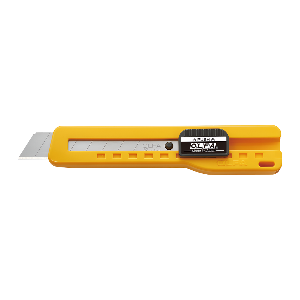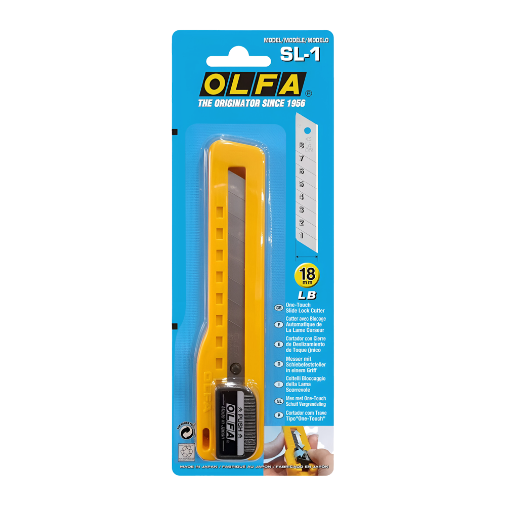 The OLFA 18mm Slide-Lock Utility Knife is designed for heavy-duty use with a sharp, durable carbon-tool steel blade for long-lasting performance. Featuring a unique one-touch slide-lock mechanism, it ensures the blade is securely locked in place. The ABS plastic handle resists drops and tough jobsite conditions while remaining lighter than most other OLFA cutters. Its 8-segment blades offer extended use with easy snapping, and the tool-free blade changes save time, making it a reliable and efficient cutting tool for any project. Preloaded with a 18mm LB Silver Snap Off Blade for use straight out of the package. Accepts all OLFA 18mm Heavy Duty Blades: LB, LBB, LFB, LWB, L-SOL, LH