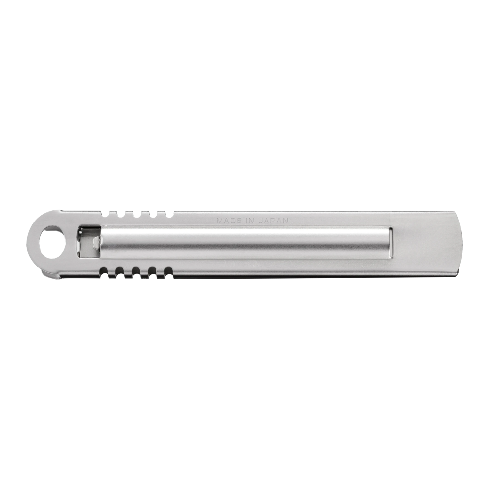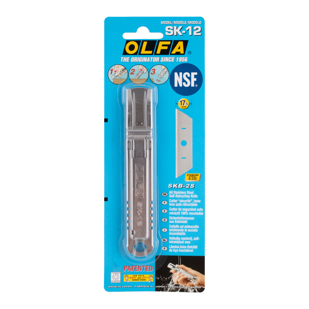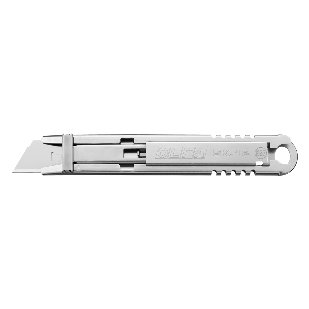 The OLFA Semi-Automatic Stainless-Steel Self-Retracting Safety Knife is ideal for food processing environments. Fully metal detectable and NSF Certified, it ensures safety and compliance. Its 100% stainless steel, paint-free design prevents contamination. The spring-activated blade retracts automatically for added protection, while flush vents allow easy cleaning and enhance grip. A lanyard hole provides convenient storage. Designed for both right- and left-handed users, it offers tool-free blade changes. Note: This knife is not intended for cutting food itself. Preloaded with a SKB-2S Stainless Steel Dual-Edge Safety Blade for use straight out of the package. Accepts OLFA Stainless Steel Safety Blades: SKB-2S, SKB-2S-R