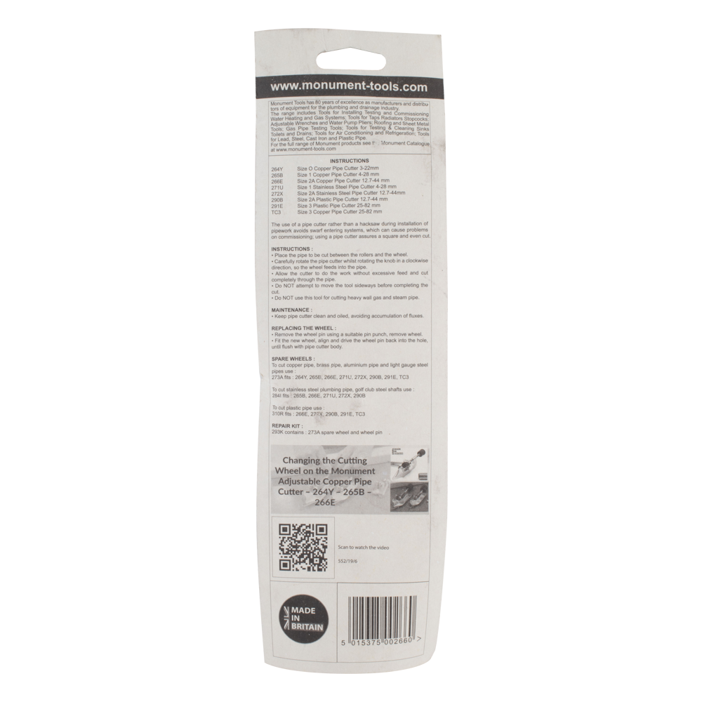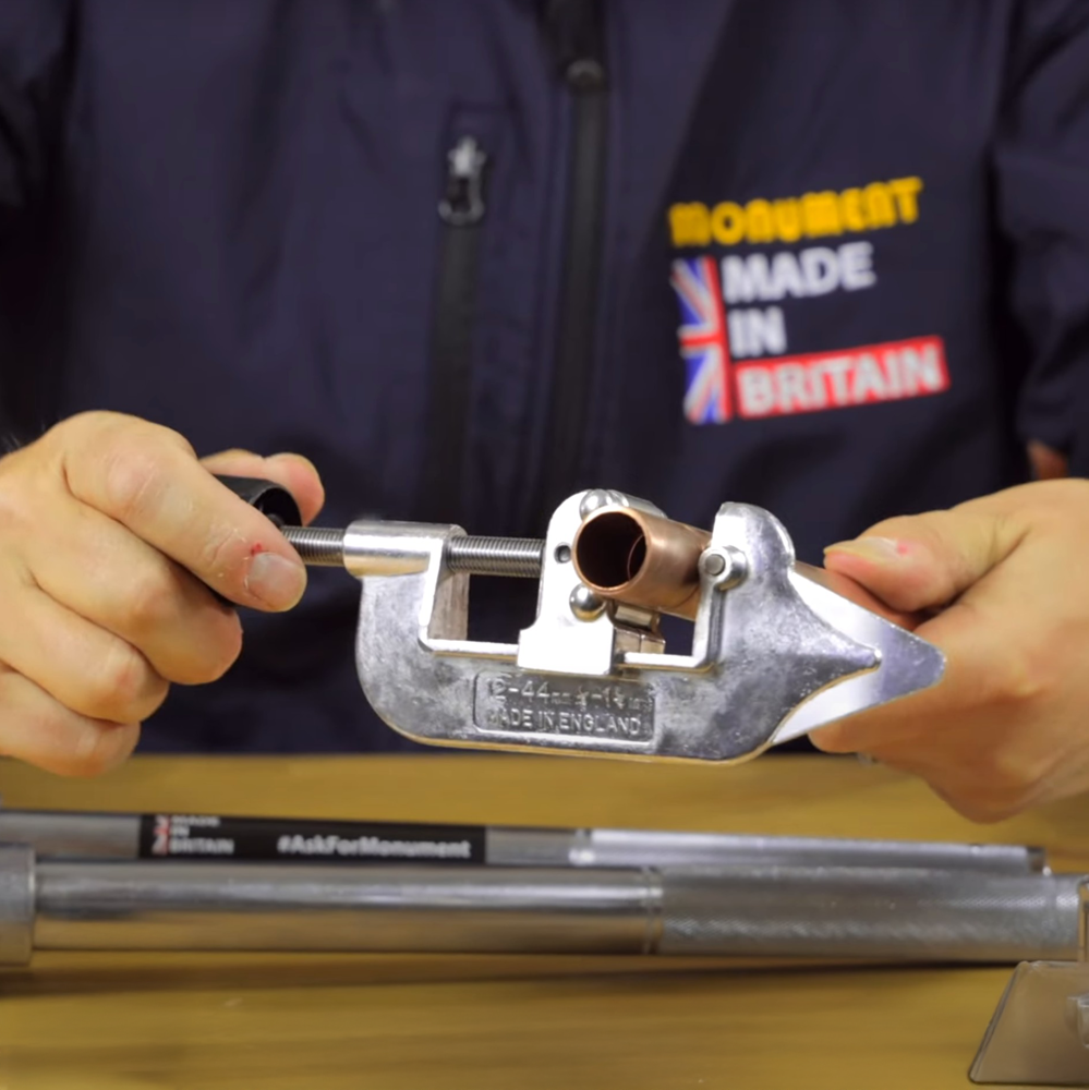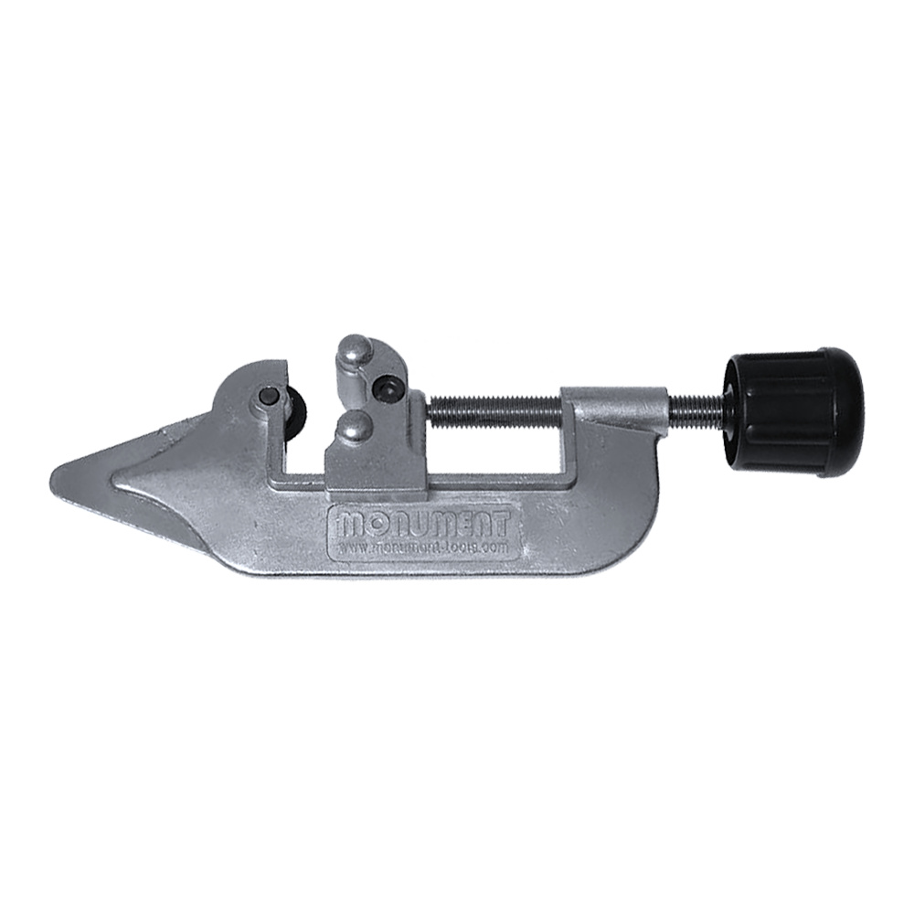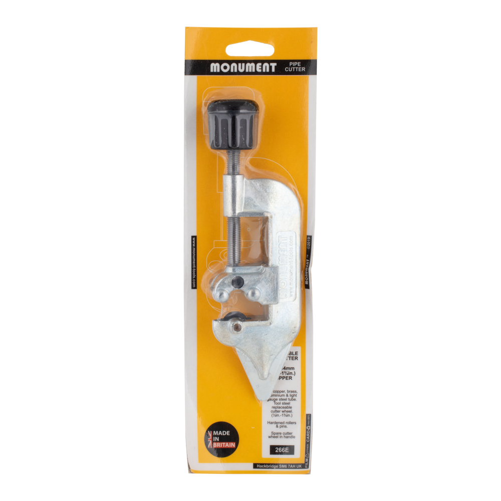 The Monument Adjustable Pipe Cutter is designed for cutting thin-walled metal pipes, including copper, brass, aluminium, and light gauge steel. Its adjustable mechanism accommodates pipe diameters from 12.7mm to 44mm. The body is constructed from zinc diecast, with heat-treated components in all wear-prone areas, including hardened rollers and pins. The tip of the body design is an integrated pipe-deburrer. It features a preloaded, replaceable, heat-treated steel cutting wheel, with a spare wheel stored in the handle. Blade replacement is straightforward, requiring only the removal of the wheel pin. Made in Britain.