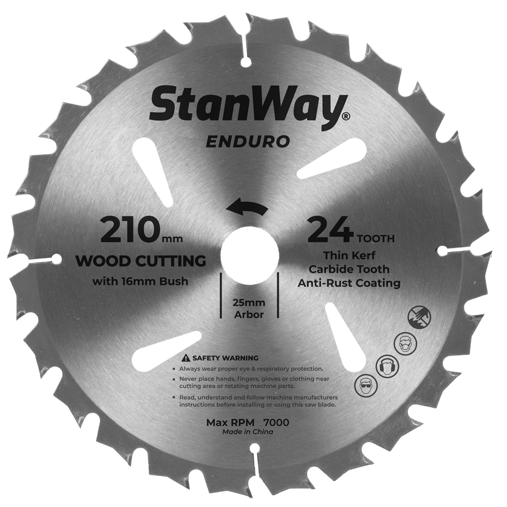A heavy-duty quality wood cutting saw blade for professional use. A suitable replacement blade for any 210mm circular saw. Complete with one bush for a 16mm arbor. The Stanway Tungsten Carbide Tipped Saw Blades are designed for wood cutting. Ideal for general purpose applications such as trimming and finishing cuts through materials including hardwoods, softwoods, composite materials, MDF and plywoods. For corded and cordless handheld circular saws and mitre saws. Suitable for all trades people and the serious DIY users.