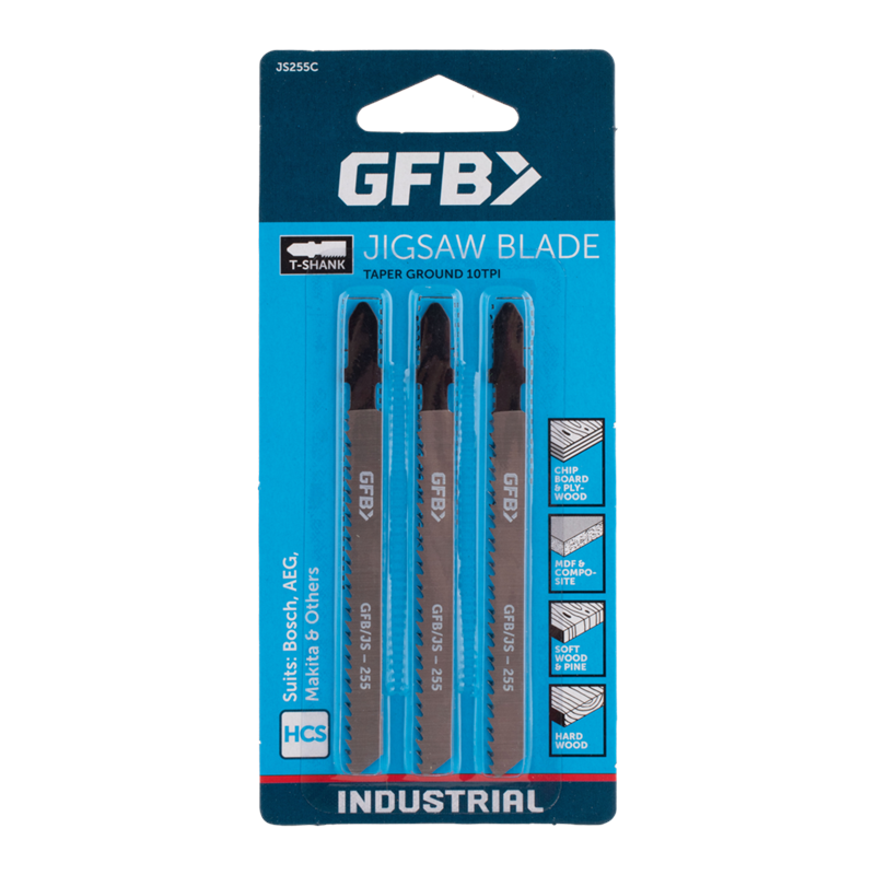 GFB Jigsaw Blades are precision-manufactured to the highest quality standards, ensuring sharpness and durability. Crafted from High Carbon Steel (HCS), these tapered ground blades with 10 teeth per inch (tpi) are ideal for cutting through plywood, chipboard, MDF, composite boards, soft and hard wood, and plastics. Each pack includes three U-Shank blades, which are compatible with leading brands like Black® & Decker®, Ryobi® & others, making them a versatile choice for various cutting tasks.