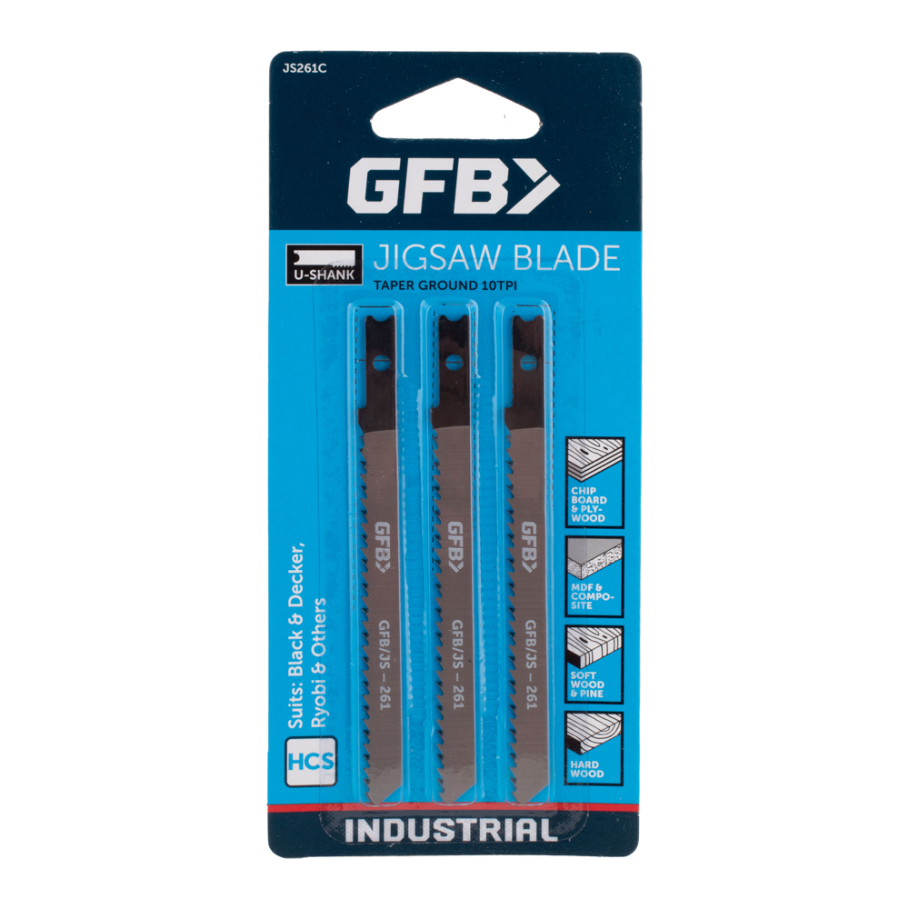 GFB Jigsaw Blades are precision-manufactured to the highest quality standards, ensuring sharpness and durability. Crafted from High Carbon Steel (HCS), these tapered ground blades with 10 teeth per inch (tpi) are ideal for cutting through plywood, chipboard, MDF, composite boards, soft and hard wood, and plastics. Each pack includes three U-Shank blades, which are compatible with leading brands like Black® & Decker®, Ryobi® & others, making them a versatile choice for various cutting tasks.