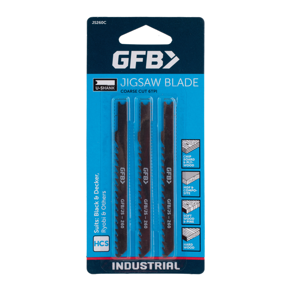 GFB Jigsaw Blades are precision-manufactured to the highest quality standards, ensuring sharpness and durability. Crafted from High Carbon Steel (HCS), these coarse cut blades with 6 teeth per inch (tpi) are ideal for cutting through plywood, chipboard, MDF, composite boards, soft and hard wood, and plastics. Each pack includes three U-Shank blades, which are compatible with leading brands like Black® & Decker®, Ryobi® & others, making them a versatile choice for various cutting tasks.