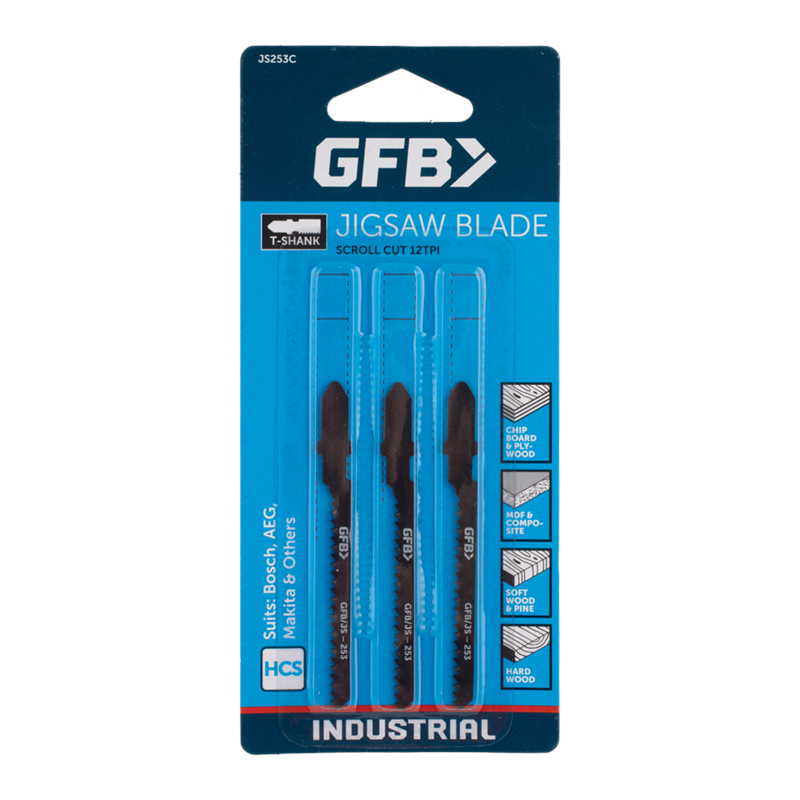 GFB Jigsaw Blades are precision-manufactured to the highest quality standards, ensuring sharpness and durability. Crafted from High Carbon Steel (HCS), these scroll cut blades with 14 teeth per inch (tpi) are ideal for cutting through plywood, chipboard, MDF, composite boards, soft and hard wood, and plastics. Each pack includes three U-Shank blades, which are compatible with leading brands like Black® & Decker®, Ryobi® & others, making them a versatile choice for various cutting tasks.
