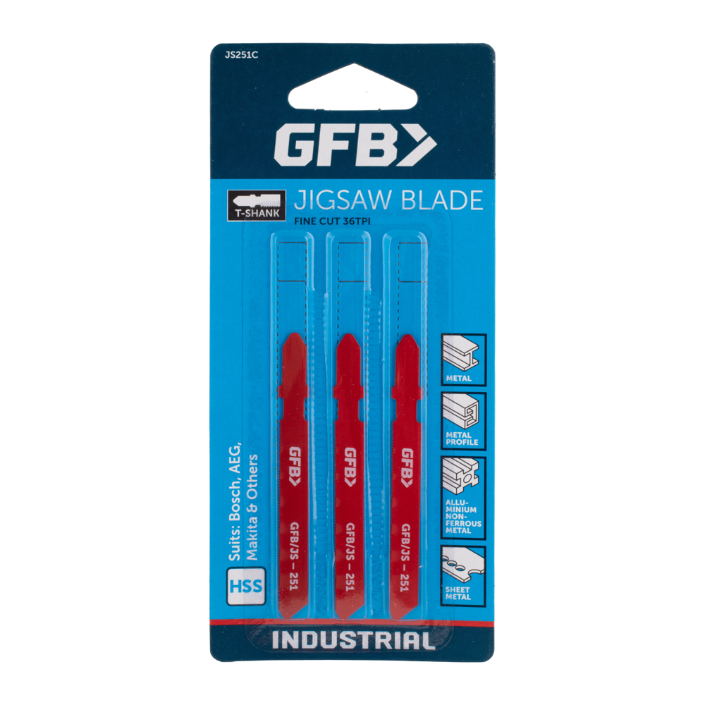 GFB Jigsaw Blades are precision-manufactured to the highest quality standards, ensuring sharpness and durability. Crafted from High Speed Steel (HSS), these fine cut blades with 32 teeth per inch (tpi) are ideal for cutting through fine metal, metal profile, aluminium, non-ferrous metals, sheet metal, zinc and metal guttering. Each pack includes three T-Shank blades, which are compatible with leading brands like Bosch®, AEG®, Festo®, Hitachi®, Metabo®, Makita®, and others, making them a versatile choice for various cutting tasks.