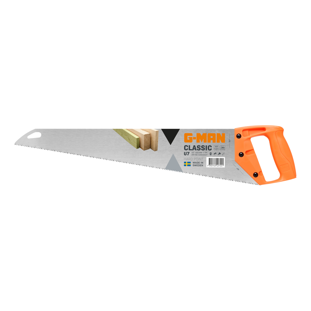 The G-MAN classic traditional 22-inch hand saw is a versatile tool designed for challenging cross-cutting tasks. With its high-quality construction, this saw is favored by professionals in various trades and DIY enthusiasts alike. The comfortable orange plastic handle, secured firmly with three screws, ensures a steady grip during usage. Its hardpoint finish enhances its durability, while the diamond ground teeth and hardpoint teeth contribute to prolonged lifespan and efficient cutting. Featuring the U7 universal toothing, this saw excels in both cutting and ripping, albeit only on push strokes. Proudly manufactured in Sweden.