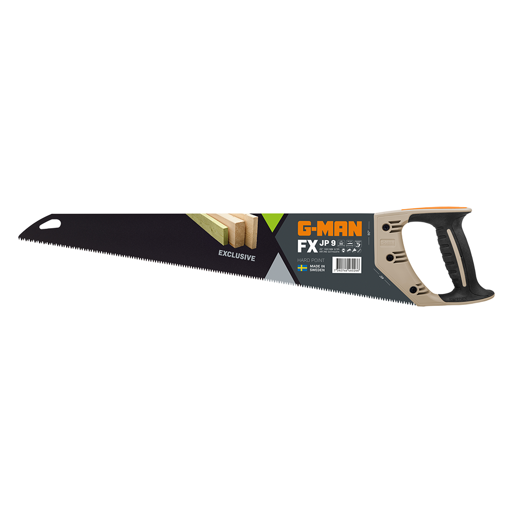 Introducing the G-MAN Exclusive FX Hand Saw, an ideal tool for both pruning and delicate carpentry tasks. With exceptional quality and a speedy cut, this saw boasts 9 razor sharp teeth per inch. Its unique 3-edge toothing offers a perfect blend of cutting ability and a smooth, clean finish. Equipped with coarse, hardpoint teeth, it outlasts conventional alternatives by staying sharp 3-5 times longer. The hardened teeth prevent resharpening, ensuring consistent performance. The FX line’s thicker blade material reduces vibrations, granting superior stability and precision. It features a newly designed ergonomic handle made from almost 100% bio-based materials - wood fibres and bio-based plastic - combined with a recycled soft grip for comfort. Manufactured with pride in Sweden.
