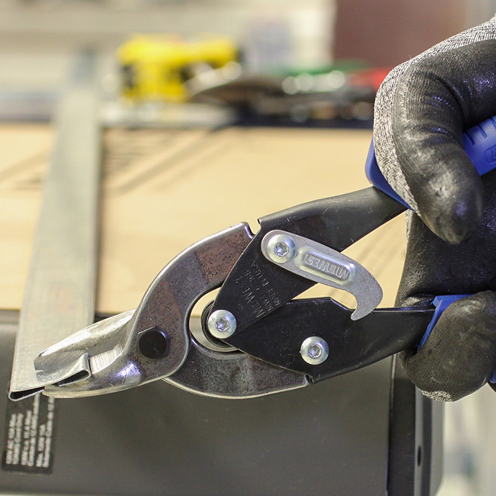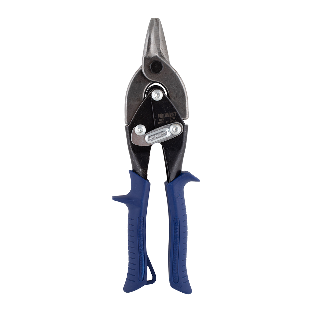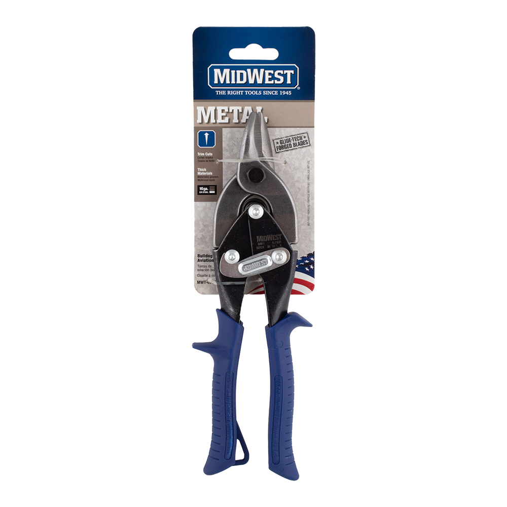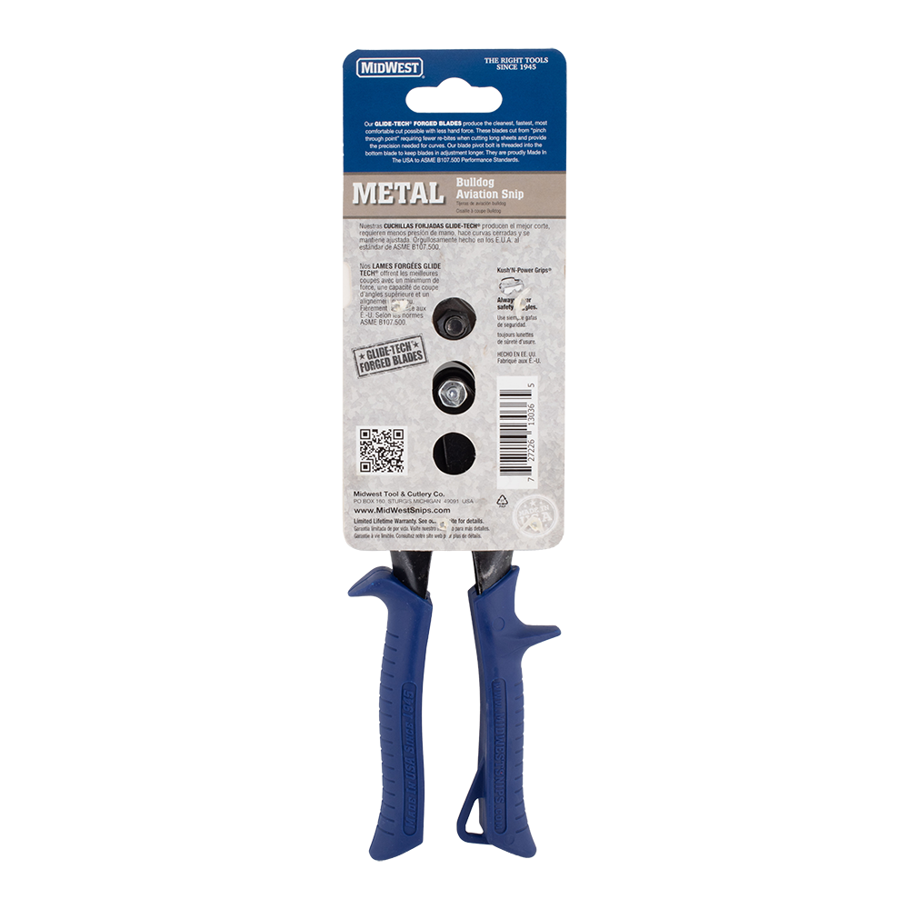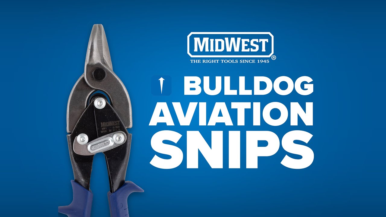 Midwest® Bulldog Aviation Snips cut trim and thick material up to 16 gauge cold rolled steel and cut multiple layers of sheet material such as cleat and rolled seams. Used for cutting straight or wide curves. Use in either hand. These snips feature GLIDETECH® Forged Blades: unequaled strength, longest lasting edge life, and the most precise cutting action. Blades are hot drop forged of molybdenum alloy steel and Austemper® heat-treated to best accept and hold their precision ground cutting edge. Blades cut complete from “pinch of the blades through their points” and pivot on a Grade 8 bolt that is threaded and affixed into the bottom blade keeping blades in precision adjustment, and if ever necessary, allowing them to be readjusted extending peak performance. Equipped with KUSH’N-POWER® compound leverage handle action which multiplies handle force while providing a soft, sturdy and comfortable grip. Made in USA!