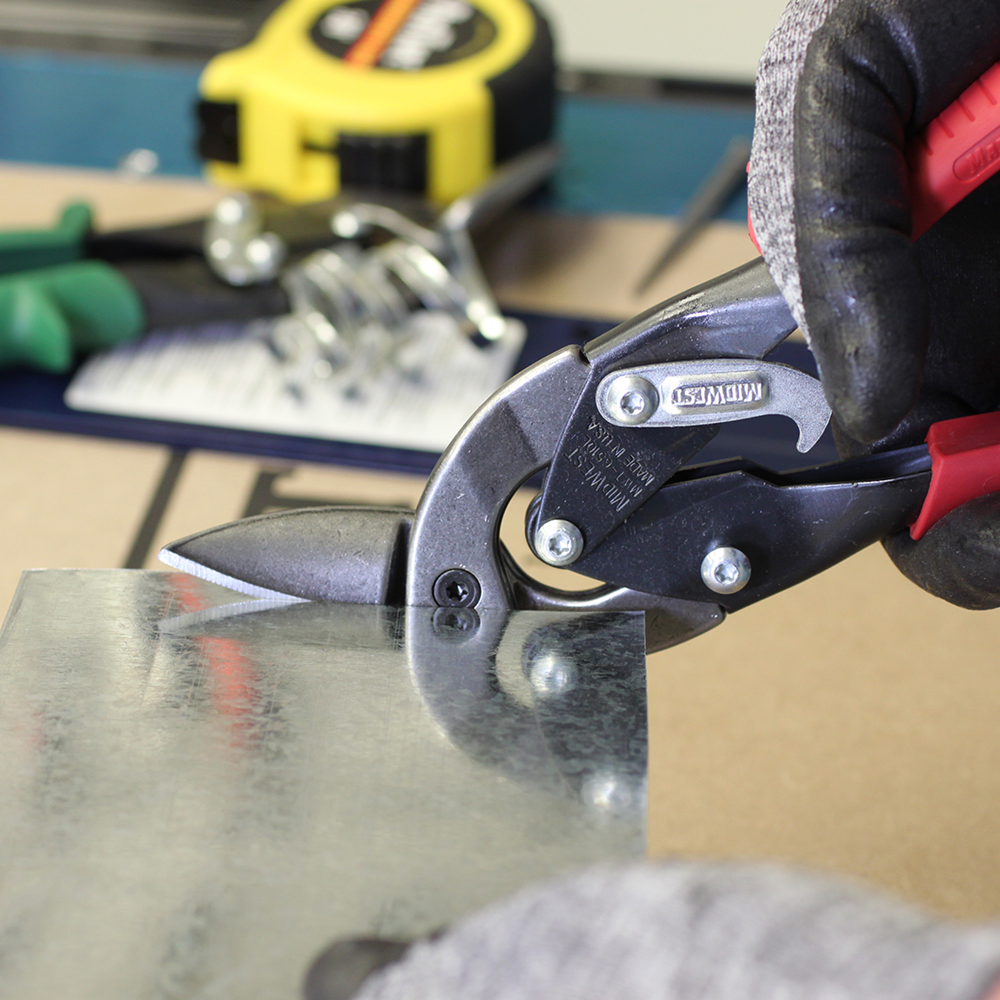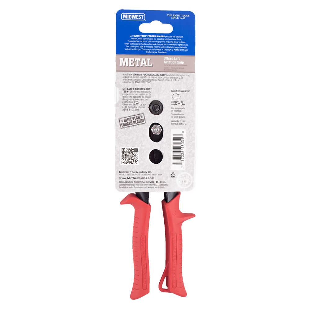 MIDWEST® Offset Left Cut Aviation Snips flow material away from blades and position the user’s hand above the material for best maneuverability when making long cuts or tight curves. Used for cutting straight or tight curves to the left. Best used in the right hand. These snips feature GLIDETECH® FORGED BLADES: unequaled strength, longest lasting edge life, and the most precise cutting action. Blades are hot drop forged of molybdenum alloy steel and Austemper® heat-treated to best accept and hold their precision ground cutting edge. Blades cut complete from “pinch of the blades through their points” and pivot on a Grade 8 bolt that is threaded and affixed into the bottom blade keeping blades in precision adjustment, and if ever necessary, allowing them to be readjusted extending peak performance. Equipped with KUSH’N-POWER® (US D718,602, D719,808) compound leverage handle action which multiplies handle force while providing a soft, sturdy and comfortable grip. Made in USA!