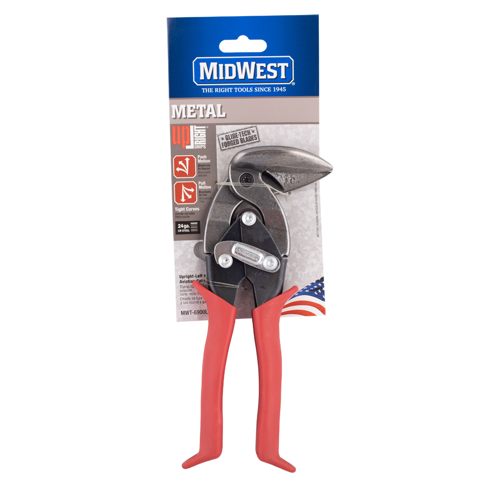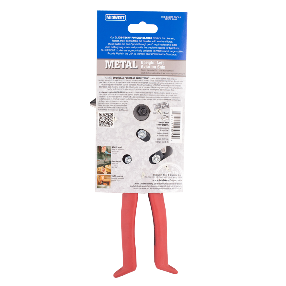 MIDWEST® UPRIGHT® Left Aviation Snips feature ergonomic handle action that reduces wrist range motion and fatigue. Can be used blades up or blades down with push or pull motion. Operates in tight spaces. Easiest used in right hand. These snips feature GLIDETECH® FORGED BLADES: unequaled strength, longest lasting edge life, and the most precise cutting action. Blades are hot drop forged of molybdenum alloy steel and Austemper® heat-treated to best accept and hold their precision ground cutting edge. Blades cut complete from “pinch of the blades through their points” and pivot on a Grade 8 bolt that is threaded and affixed into the bottom blade keeping blades in precision adjustment, and if ever necessary, allowing them to be readjusted extending peak performance. Equipped with KUSH’N-POWER® (US D718,602, D719,808) compound leverage handle action which multiplies handle force while providing a soft, sturdy and comfortable grip. Made in USA!