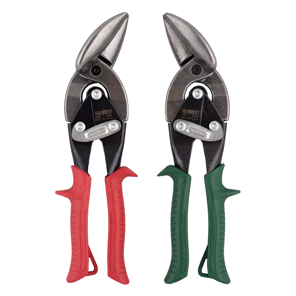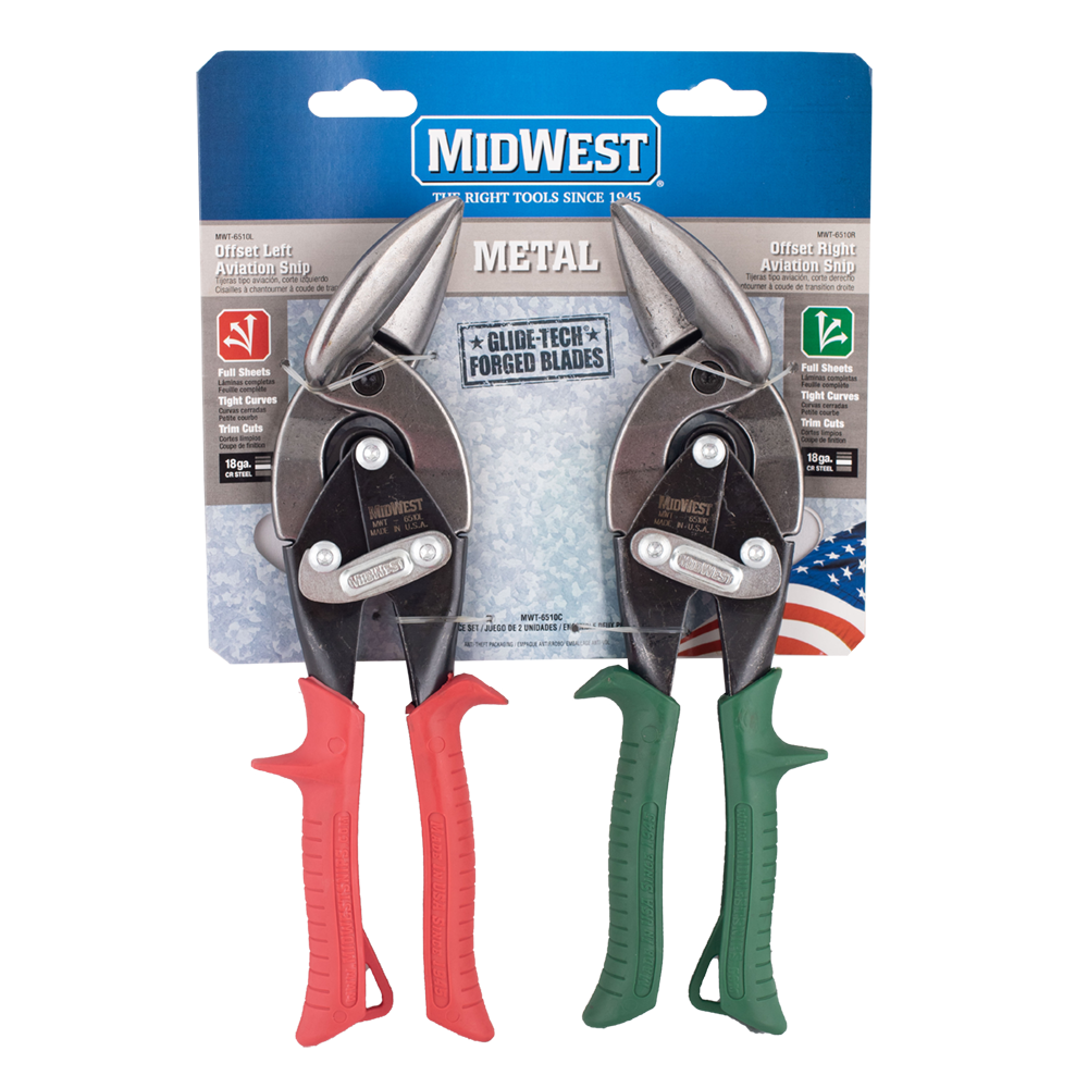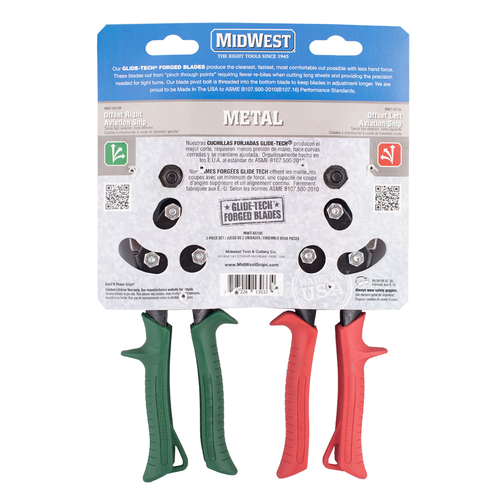 MIDWEST® 2 Piece Offset Aviation Snip Sets include an Offset Left and Offset Right Aviation Snip. Offset Aviation snips flow material away from blades and position the user’s hand above the material for best maneuverability when making long cuts or tight curves. These snips feature GLIDETECH® FORGED BLADES: unequaled strength, longest lasting edge life, and the most precise cutting action. Blades are hot drop forged of molybdenum alloy steel and Austemper® heat-treated to best accept and hold their precision ground cutting edge. Blades cut complete from “pinch of the blades through their points” and pivot on a Grade 8 bolt that is threaded and affixed into the bottom blade keeping blades in precision adjustment, and if ever necessary, allowing them to be readjusted extending peak performance. Equipped with KUSH’N-POWER® (US D718,602, D719,808) compound leverage handle action which multiplies handle force while providing a soft, sturdy and comfortable grip. Set includes models MW6510-L and MW6510-R. Made in USA!